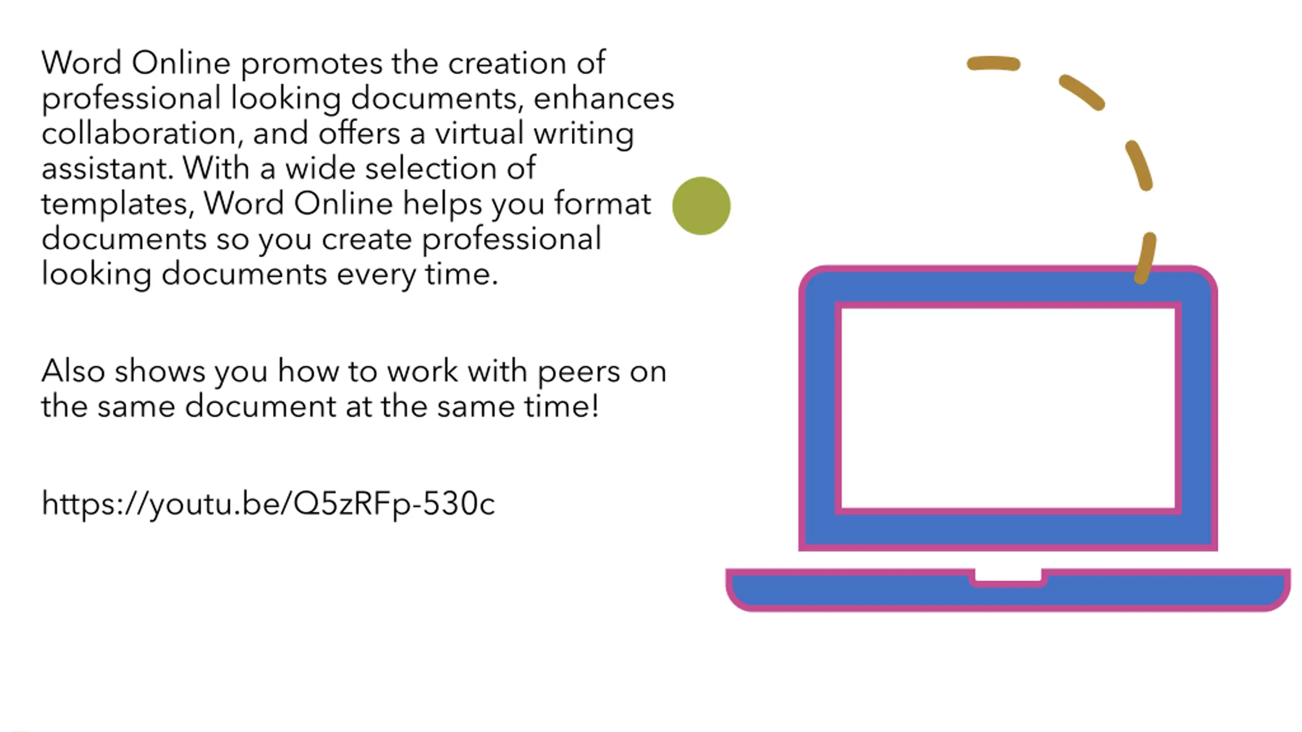 Word Online promotes the creation of professional looking documents, enhances collaboration, and offers a virtual writing assistant. With a wide selection of templates, Word Online helps you format documents so you create professional looking documents every time. Also shows you how to work with peers on the same document at the same time! https://youtu.be/Q5zRFp-530c