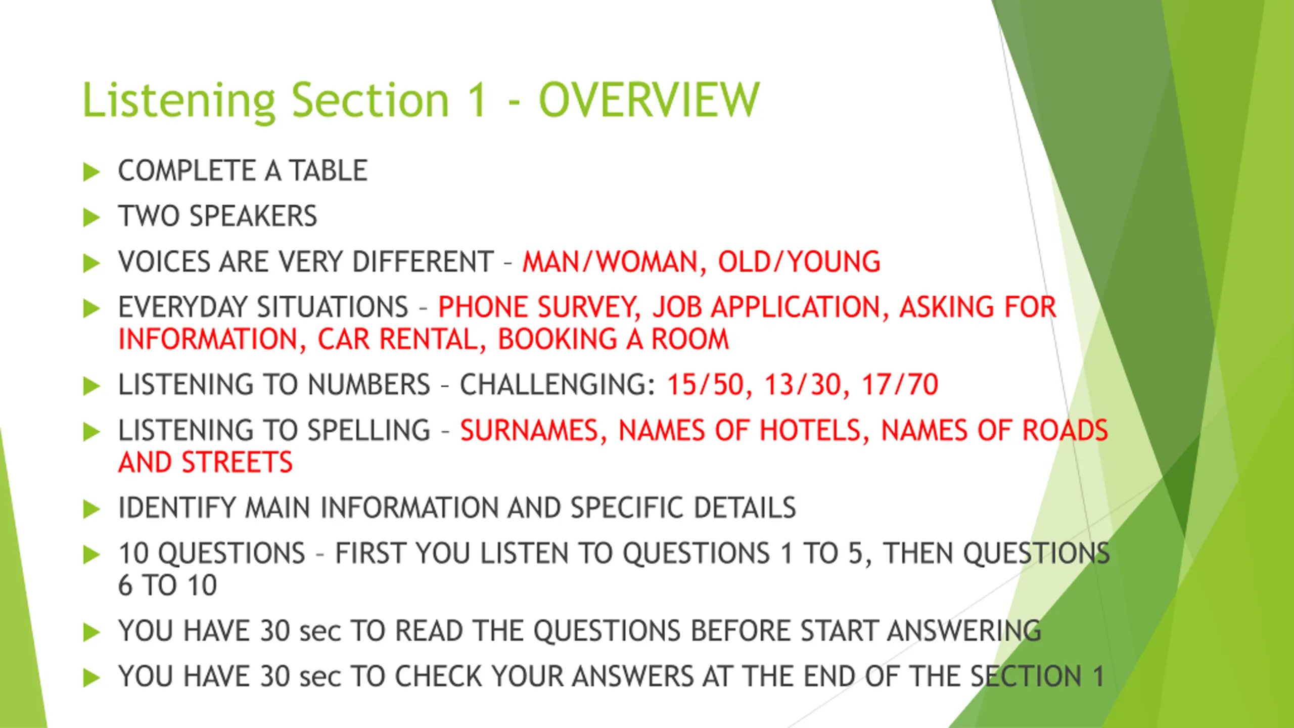 Listening Section 1 - OVERVIEW COMPLETE A TABLE TWO SPEAKERS VOICES ARE VERY DIFFERENT MAN/WOMAN, OLD/YOUNG EVERYDAY SITUATIONS PHONE SURVEY, JOB APPLICATION, ASKING FOR INFORMATION, CAR RENTAL, BOOKING A ROOM LISTENING TO NUMBERS CHALLENGING: 15/50, 13/30, 17/70 LISTENING TO SPELLING SURNAMES, NAMES OF HOTELS, NAMES OF ROADS AND STREETS IDENTIFY MAIN INFORMATION AND SPECIFIC DETAILS 10 QUESTIONS FIRST YOU LISTEN TO QUESTIONS 1 TO 5, THEN QUESTIONS 6 TO 10 YOU HAVE 30 sec TO READ THE QUESTIONS BEFORE START ANSWERING YOU HAVE 30 sec TO CHECK YOUR ANSWERS AT THE END OF THE SECTION 1