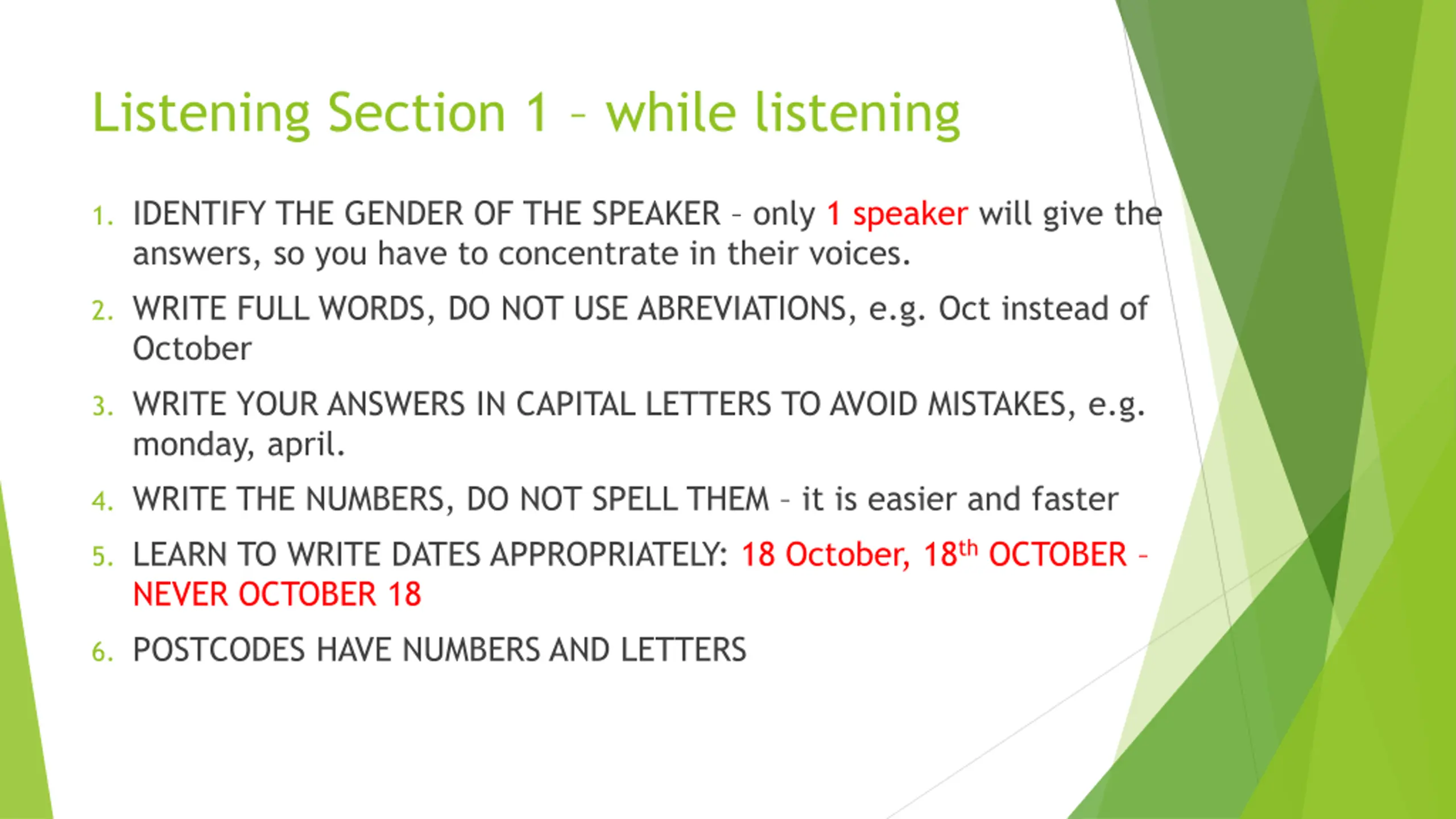 Listening Section 1 while listening 1. IDENTIFY THE GENDER OF THE SPEAKER only 1 speaker will give the answers, so you have to concentrate in their voices. 2. WRITE FULL WORDS, DO NOT USE ABREVIATIONS, e.g. Oct instead of October 3. WRITE YOUR ANSWERS IN CAPITAL LETTERS TO AVOID MISTAKES, e.g. monday, april. 4. WRITE THE NUMBERS, DO NOT SPELL THEM it is easier and faster 5. LEARN TO WRITE DATES APPROPRIATELY: 18 October, 18thOCTOBER NEVER OCTOBER 18 6. POSTCODES HAVE NUMBERS AND LETTERS