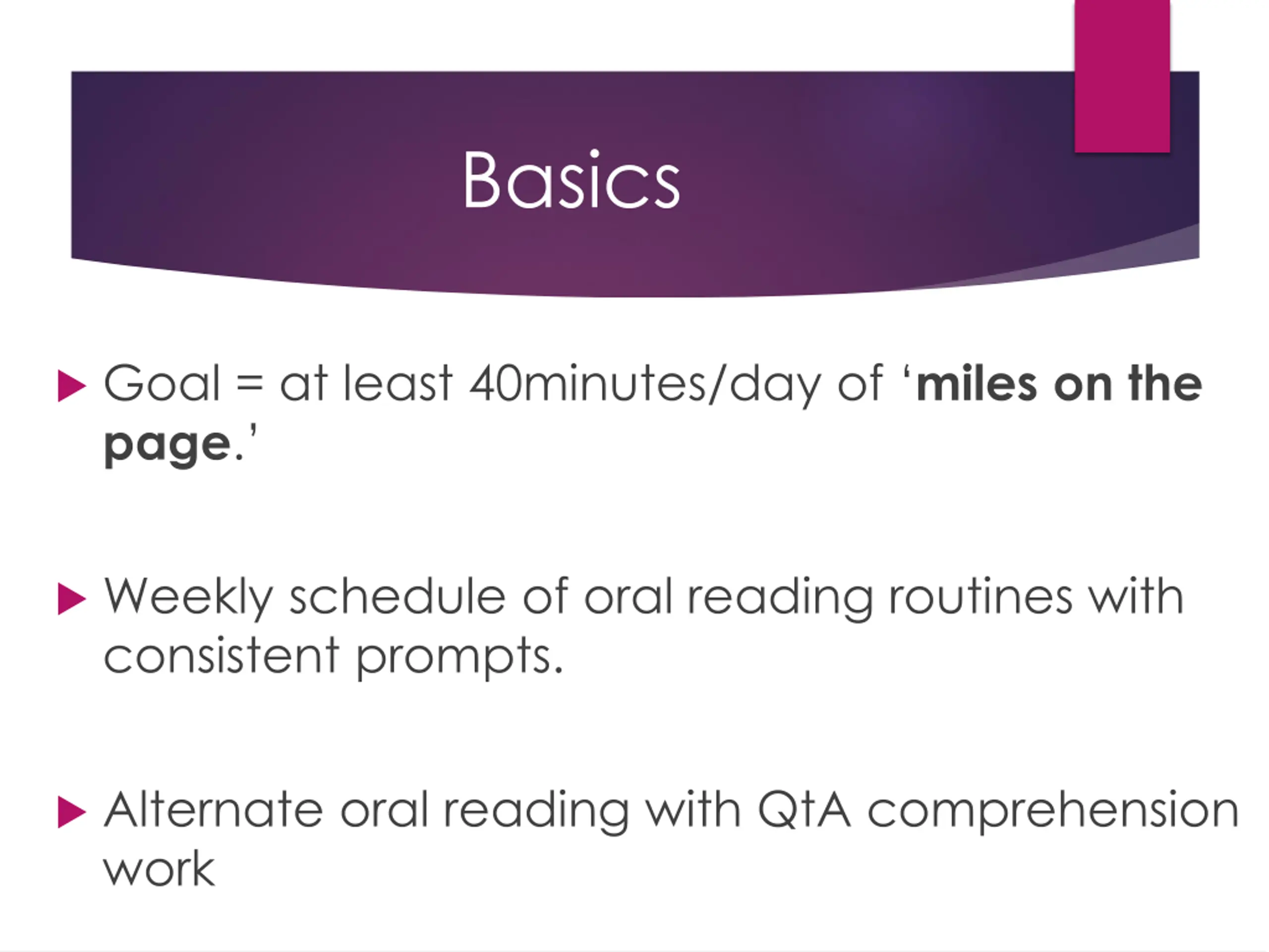 Basics Goal = at least 40minutes/day of miles on the page. Weekly schedule of oral reading routines with consistent prompts. Alternate oral reading with QtA comprehension work