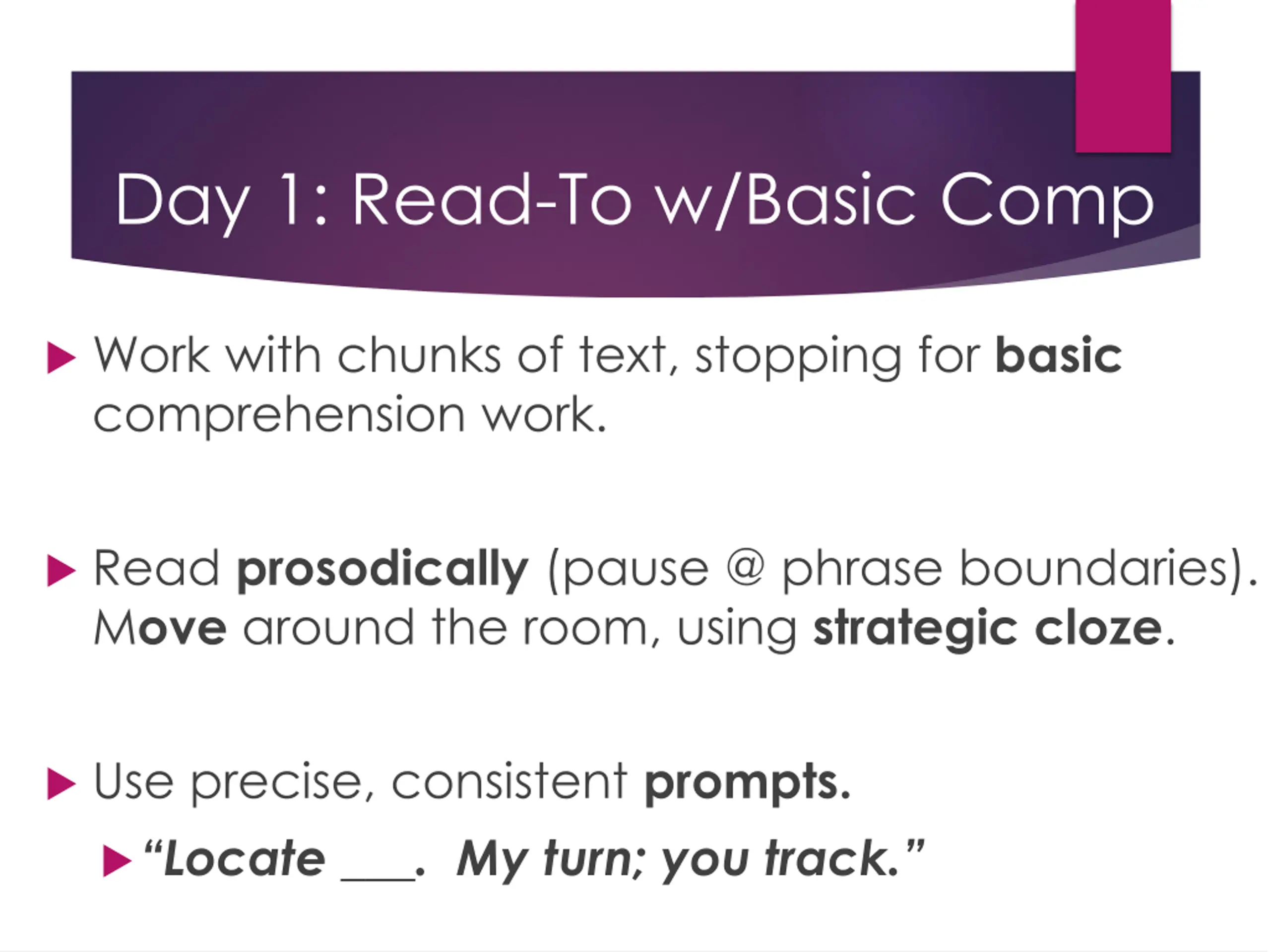 Day 1: Read-To w/Basic Comp Work with chunks of text, stopping for basic comprehension work. Read prosodically (pause @ phrase boundaries). Move around the room, using strategic cloze. Use precise, consistent prompts. Locate ___. My turn; you track.
