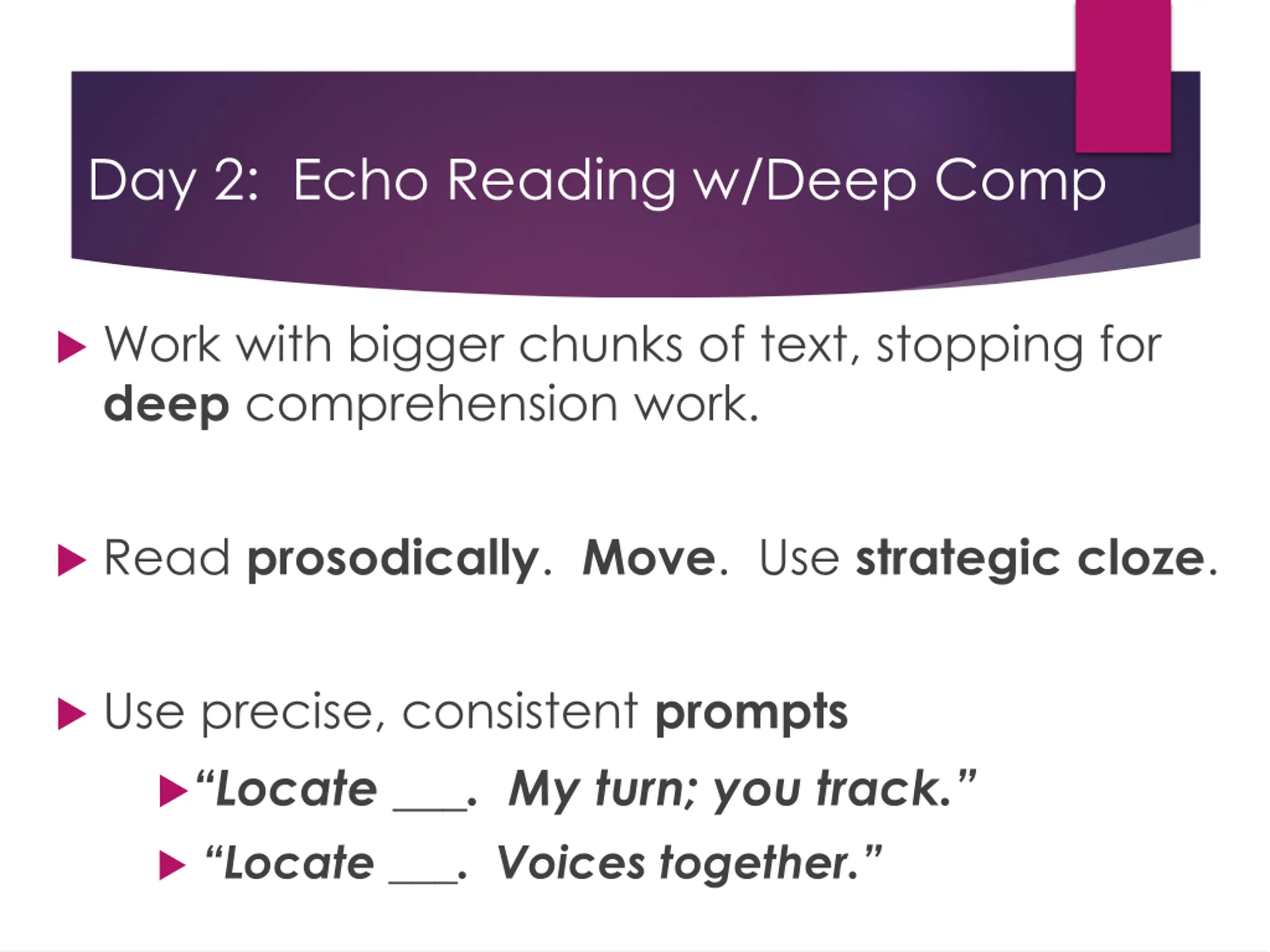 Day 2: Echo Reading w/Deep Comp Work with bigger chunks of text, stopping for deep comprehension work. Read prosodically. Move. Use strategic cloze. Use precise, consistent prompts Locate ___. My turn; you track. Locate ___. Voices together.