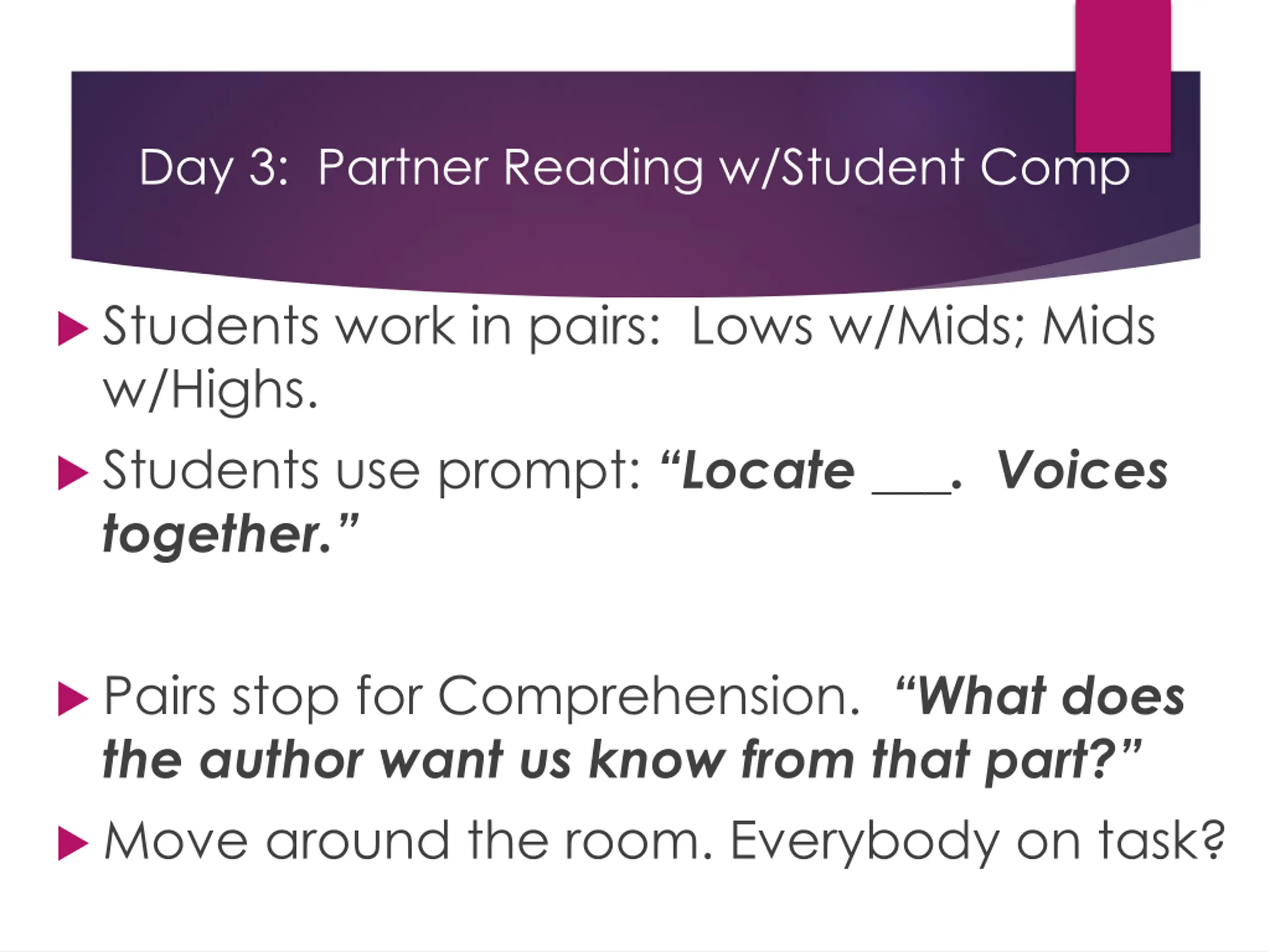 Day 3: Partner Reading w/Student Comp Students work in pairs: Lows w/Mids; Mids w/Highs. Students use prompt: Locate ___. Voices together. Pairs stop for Comprehension. What does the author want us know from that part? Move around the room. Everybody on task?
