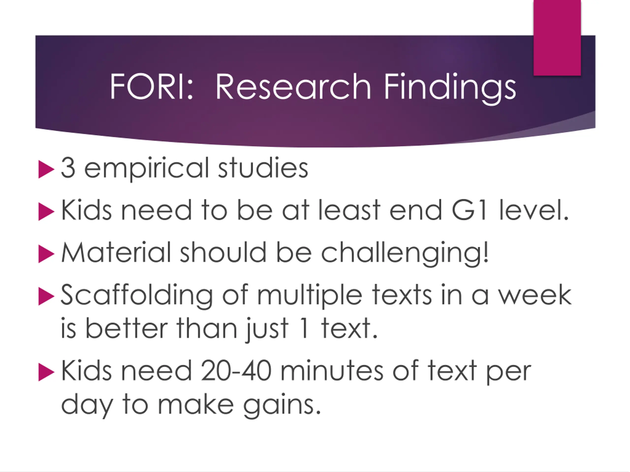 FORI: Research Findings 3 empirical studies Kids need to be at least end G1 level. Material should be challenging! Scaffolding of multiple texts in a week is better than just 1 text. Kids need 20-40 minutes of text per day to make gains.