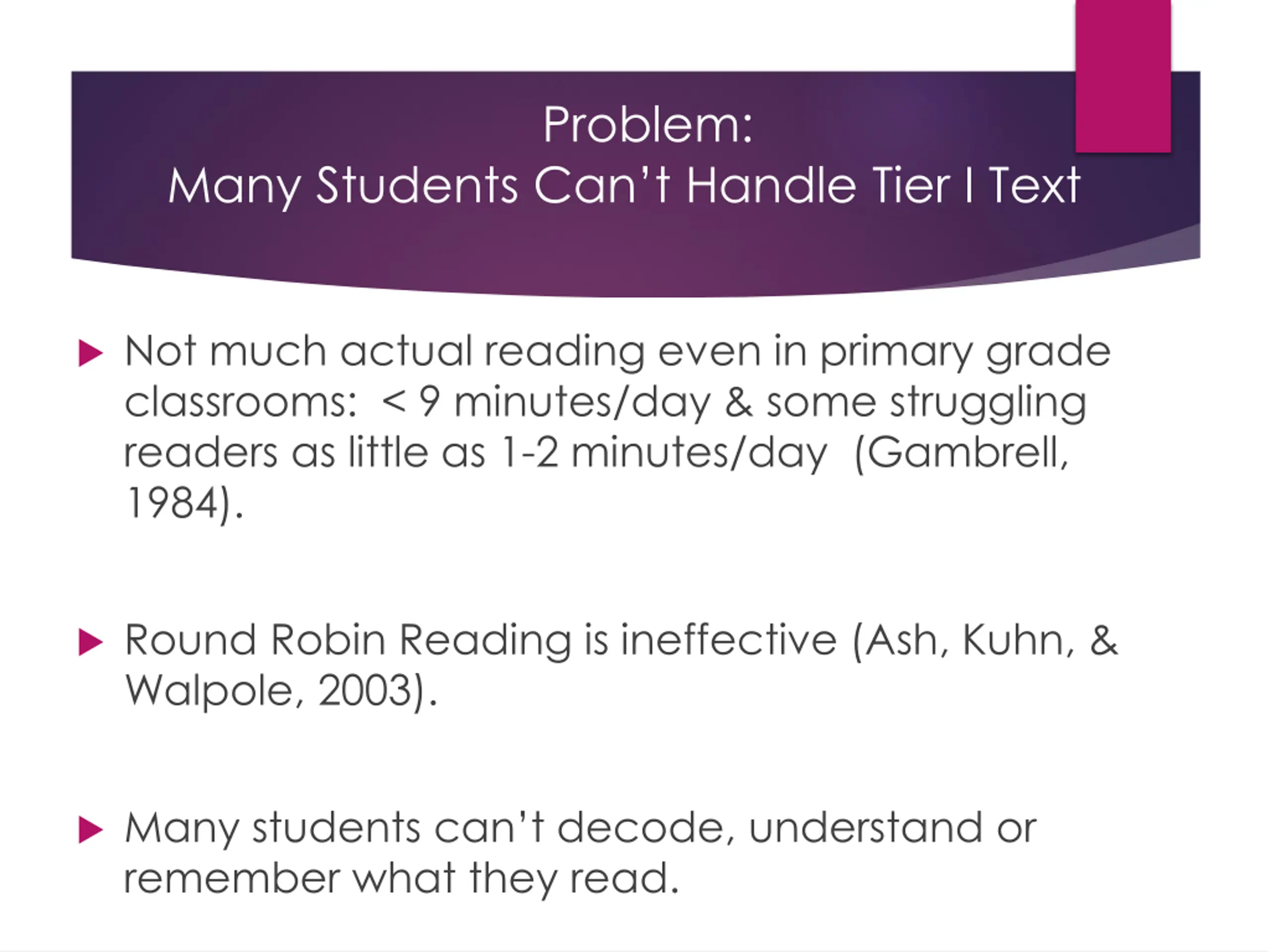 Problem: Many Students Can t Handle Tier I Text Not much actual reading even in primary grade classrooms: < 9 minutes/day & some struggling readers as little as 1-2 minutes/day (Gambrell, 1984). Round Robin Reading is ineffective (Ash, Kuhn, & Walpole, 2003). Many students can t decode, understand or remember what they read.