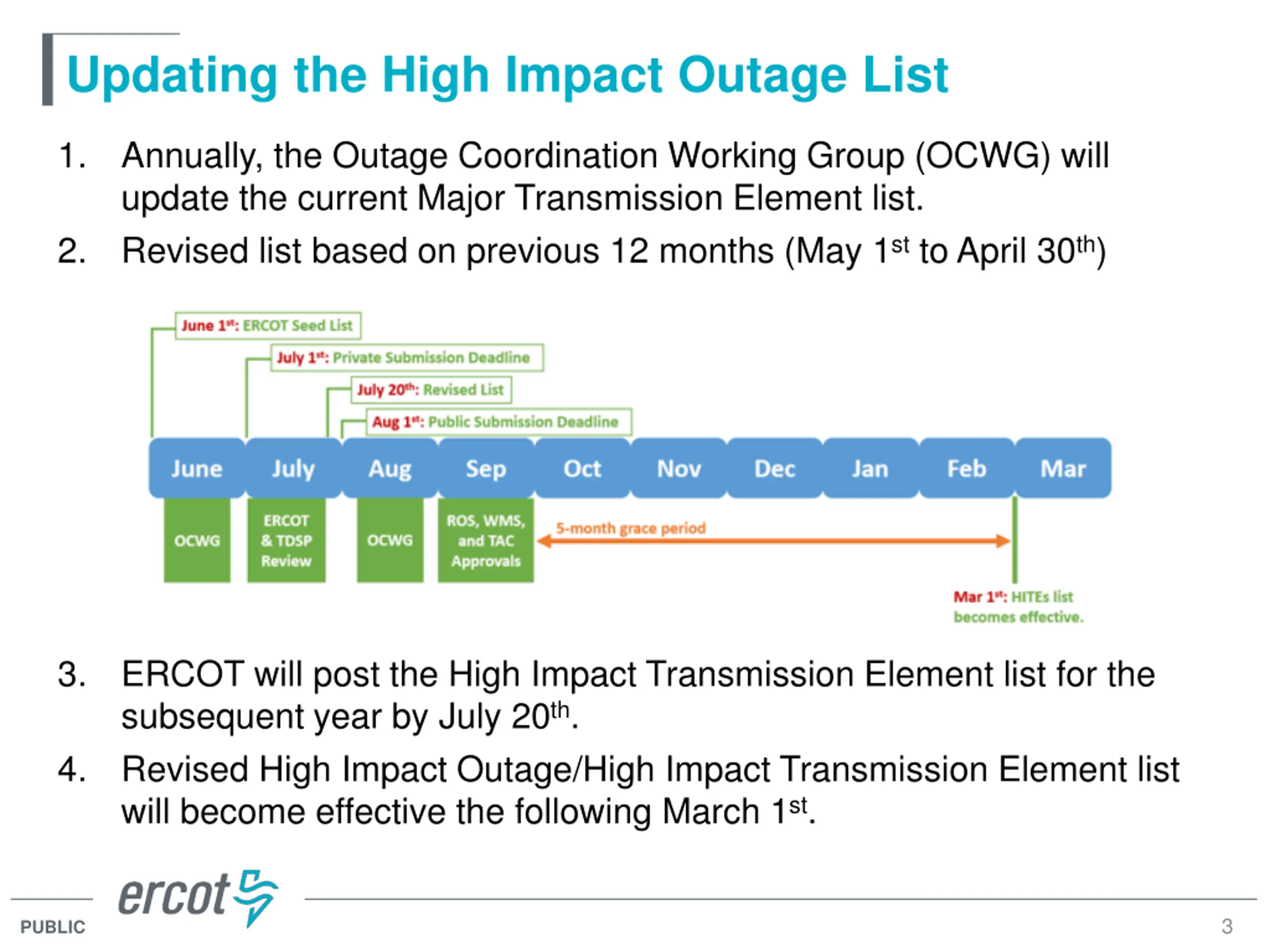 Updating the High Impact Outage List 1. Annually, the Outage Coordination Working Group (OCWG) will update the current Major Transmission Element list. Revised list based on previous 12 months (May 1st to April 30th) 2. 3. ERCOT will post the High Impact Transmission Element list for the subsequent year by July 20th. Revised High Impact Outage/High Impact Transmission Element list will become effective the following March 1st. 4. 3 PUBLIC
