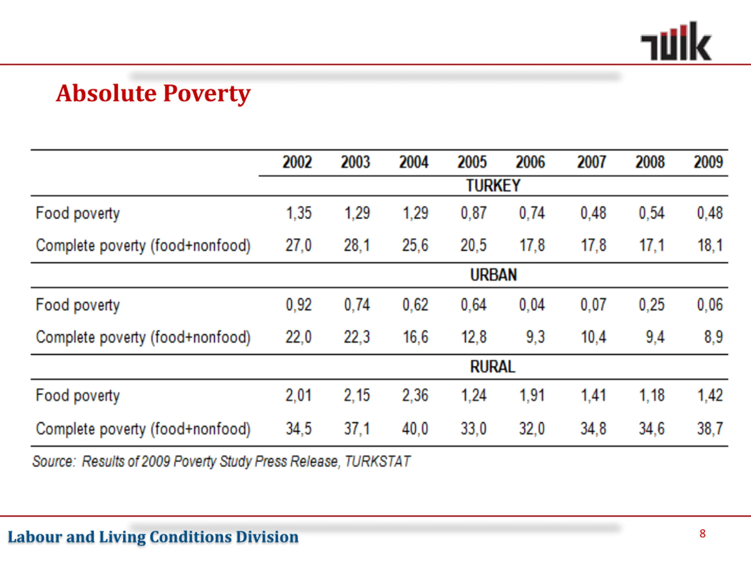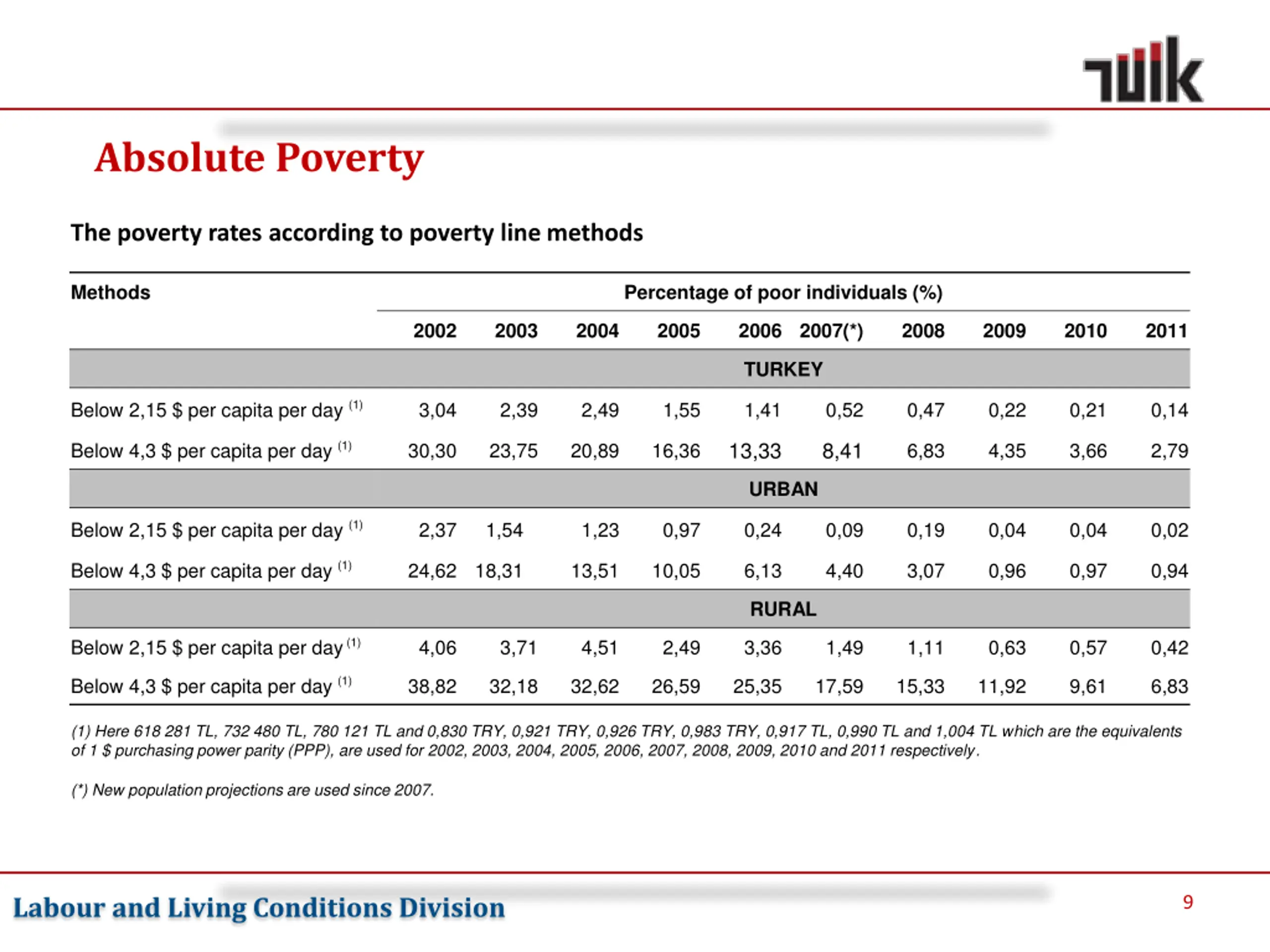 - Absolute Poverty The poverty study based on the previous methodology was used for the 2009 HBS data for the last time and the results were announced in January 2011. Afterwards; Turkish Statistical Institution has started evaluation studies in collaboration with local and international experts in order to reveal the socio-economical situation of Turkey and enable the international comparisons. Within this scope; studies on feasible data sources and new estimation methods and works on calculation of new indicators are ongoing. Labour and Living Conditions Division 6