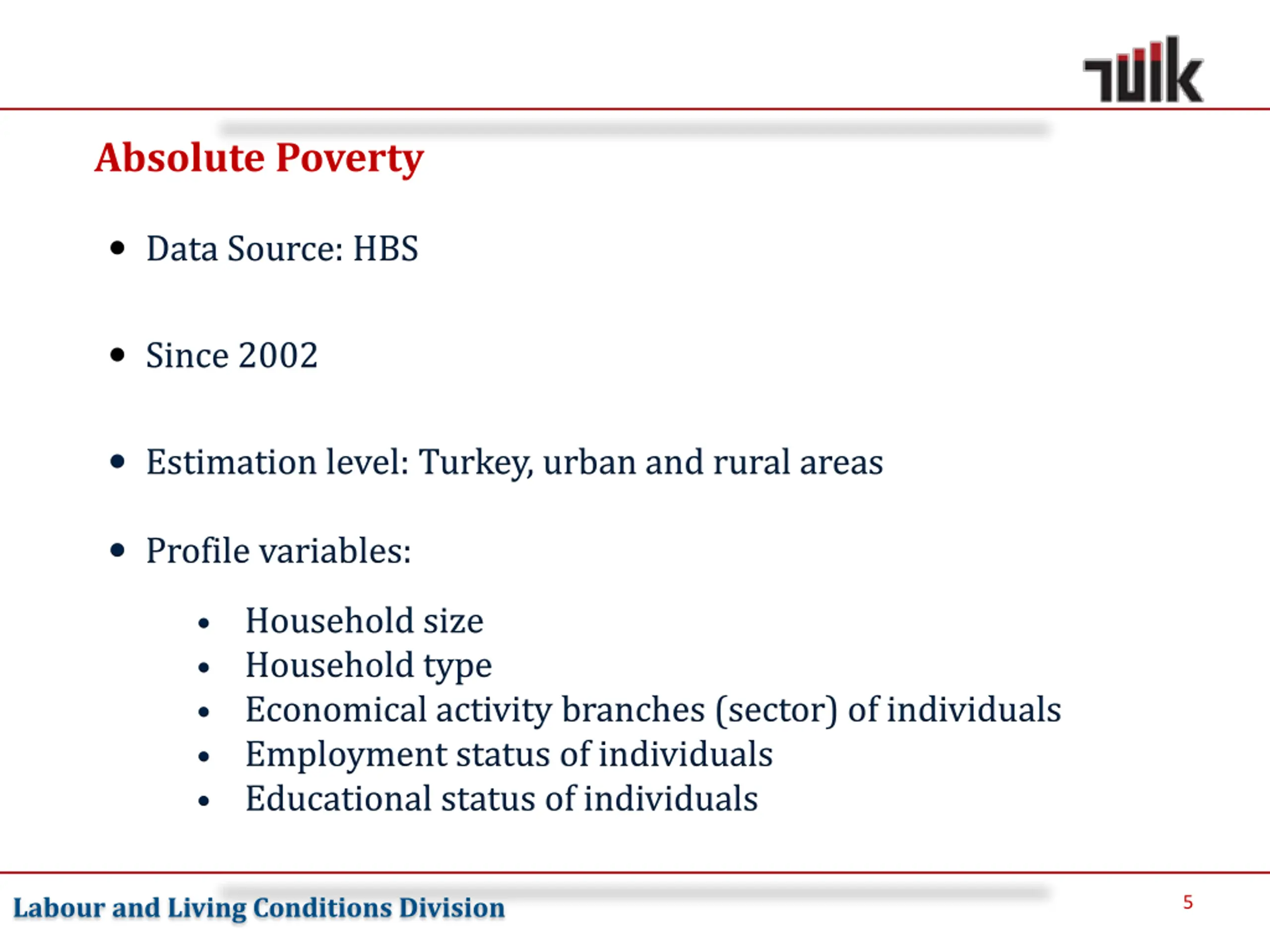 - Absolute Poverty Data Source: HBS Since 2002 Estimation level: Turkey, urban and rural areas Profile variables: Household size Household type Economical activity branches (sector) of individuals Employment status of individuals Educational status of individuals Labour and Living Conditions Division 5