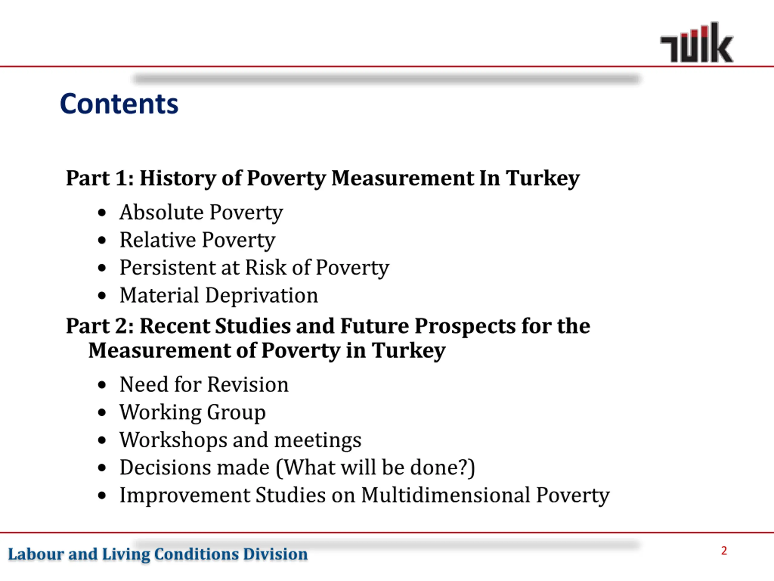 - Contents Part 1: History of Poverty Measurement In Turkey Absolute Poverty Relative Poverty Persistent at Risk of Poverty Material Deprivation Part 2: Recent Studies and Future Prospects for the Measurement of Poverty in Turkey Need for Revision Working Group Workshops and meetings Decisions made (What will be done?) Improvement Studies on Multidimensional Poverty Labour and Living Conditions Division 2