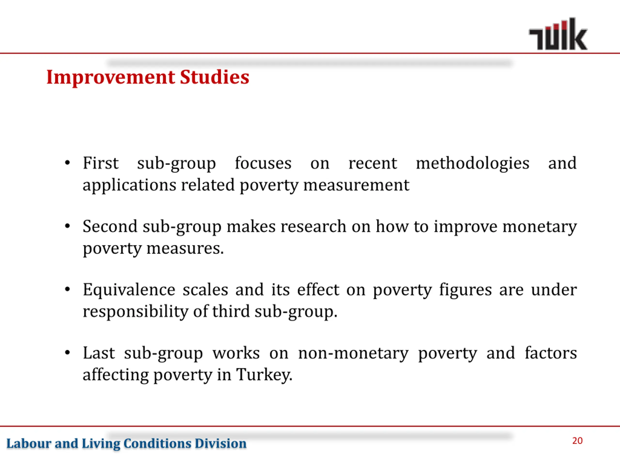 - Improvement Studies In the scope of improvement studies, a working group has been constructed by TURKSTAT representative from different national institutions and ministries, non-governmental organizationsand unions: consisting of academicians, There are four sub-groups within working group and each one study on differentaspects of poverty Labour and Living Conditions Division 19