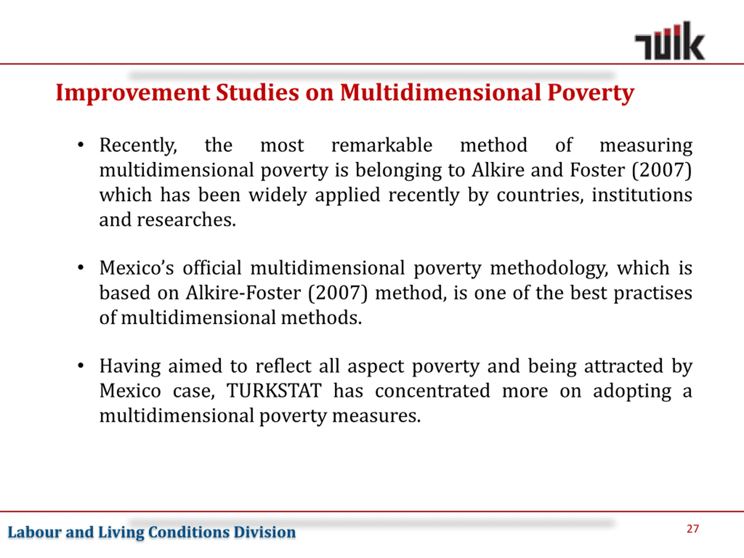 - Improvement Studies on Multidimensional Poverty Recently, multidimensional poverty is belonging to Alkire and Foster (2007) which has been widely applied recently by countries, institutions and researches. the most remarkable method of measuring Mexico s official multidimensional poverty methodology, which is based on Alkire-Foster (2007) method, is one of the best practises of multidimensional methods. Having aimed to reflect all aspect poverty and being attracted by Mexico case, TURKSTAT has concentrated more on adopting a multidimensional poverty measures. Labour and Living Conditions Division 27