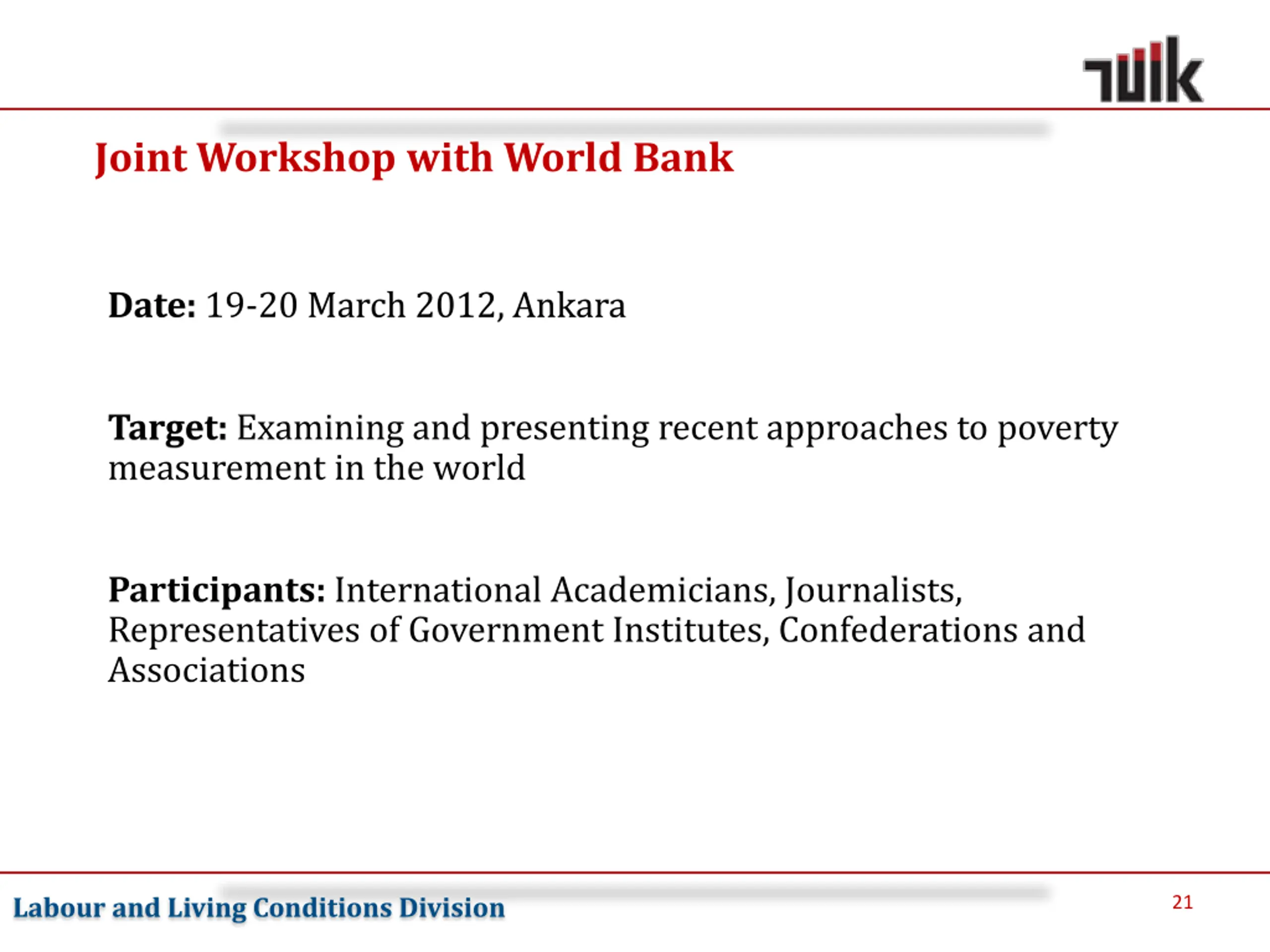 - Joint Workshop with World Bank Date: 19-20 March 2012, Ankara Target: Examining and presenting recent approaches to poverty measurement in the world Participants: International Academicians, Journalists, Representatives of Government Institutes, Confederations and Associations Labour and Living Conditions Division 21
