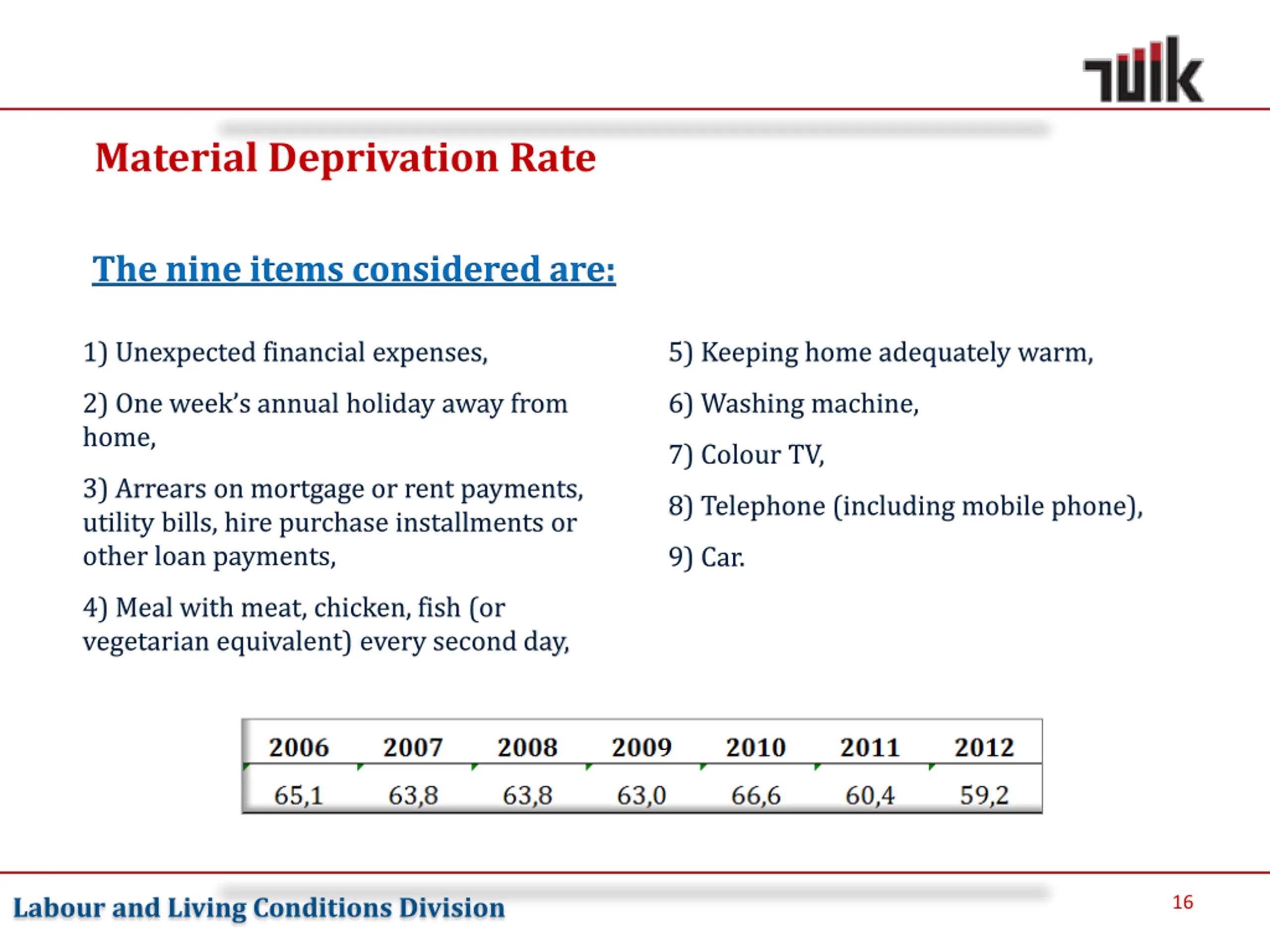 - Material Deprivation Rate The nine items considered are: 1) Unexpected financial expenses, 5) Keeping home adequately warm, 2) One week s annual holiday away from home, 6) Washing machine, 7) Colour TV, 3) Arrears on mortgage or rent payments, utility bills, hire purchase installments or other loan payments, 8) Telephone (including mobile phone), 9) Car. 4) Meal with meat, chicken, fish (or vegetarian equivalent) every second day, Labour and Living Conditions Division 16