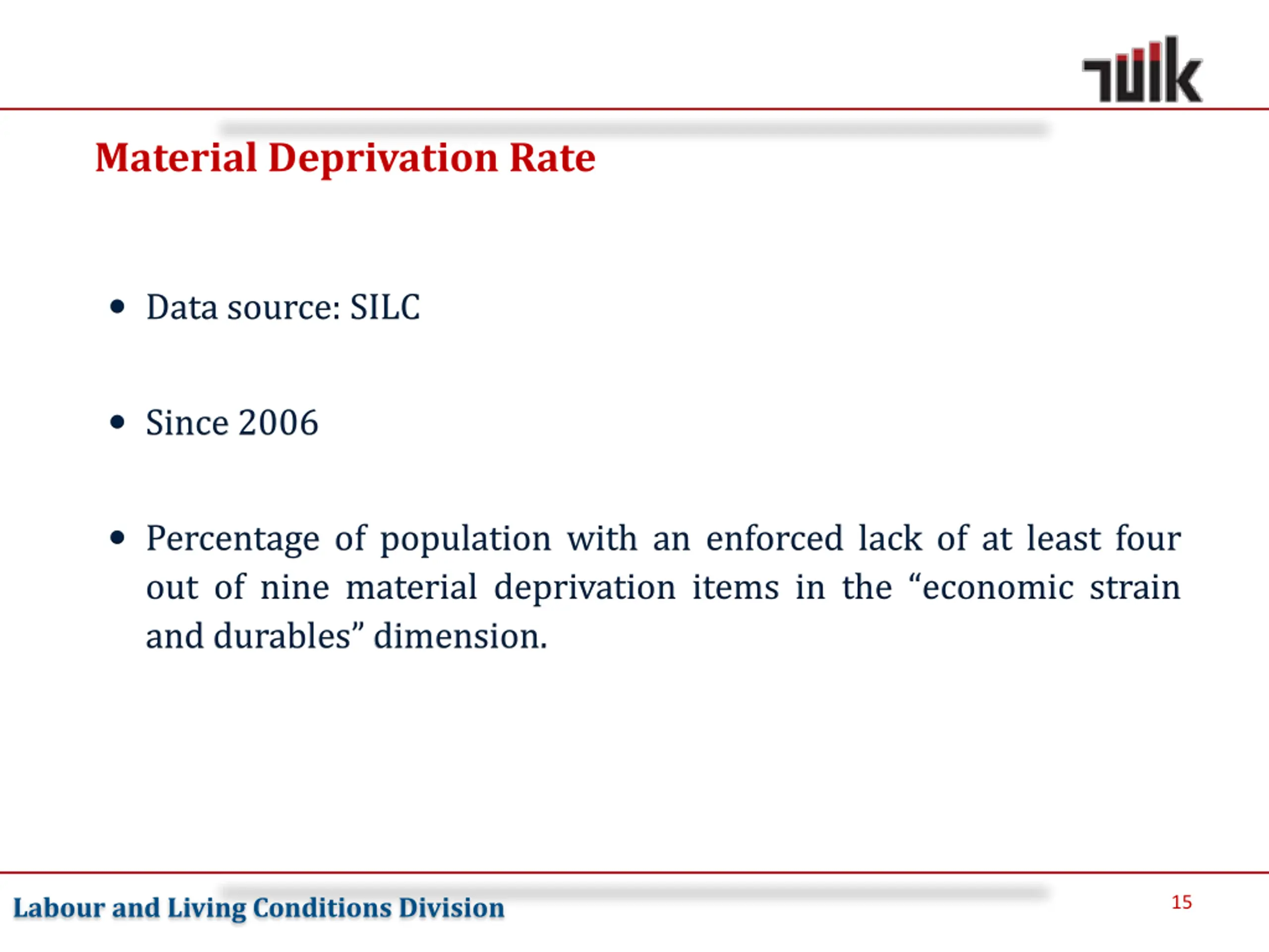 - Material Deprivation Rate Data source: SILC Since 2006 Percentage of population with an enforced lack of at least four out of nine material deprivation items in the economic strain and durables dimension. Labour and Living Conditions Division 15