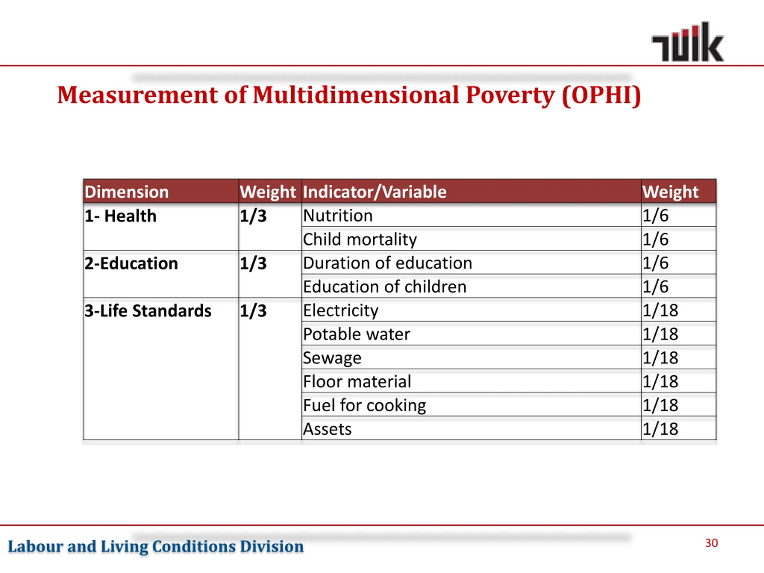 - Measurement of Multidimensional Poverty (OPHI) Dimension 1- Health Weight Indicator/Variable 1/3 Nutrition Child mortality 1/3 Duration of education Education of children 1/3 Electricity Potable water Sewage Floor material Fuel for cooking Assets Weight 1/6 1/6 1/6 1/6 1/18 1/18 1/18 1/18 1/18 1/18 2-Education 3-Life Standards Labour and Living Conditions Division 30