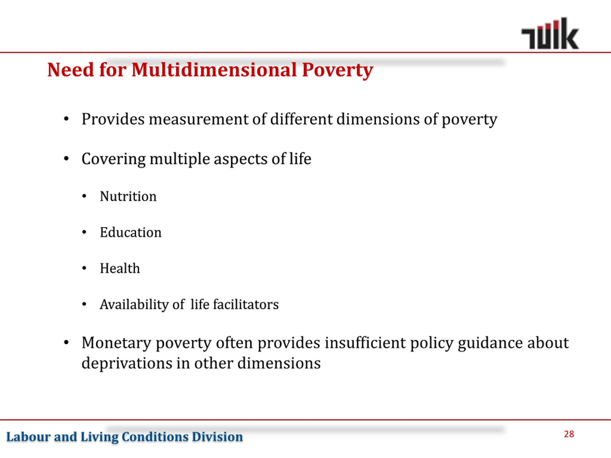 - Need for Multidimensional Poverty Provides measurement of different dimensions of poverty Covering multiple aspects of life Nutrition Education Health Availability of life facilitators Monetary poverty often provides insufficient policy guidance about deprivations in other dimensions Labour and Living Conditions Division 28 Source: estimates by CONEVAL based on MCS-ENIGH 2010.