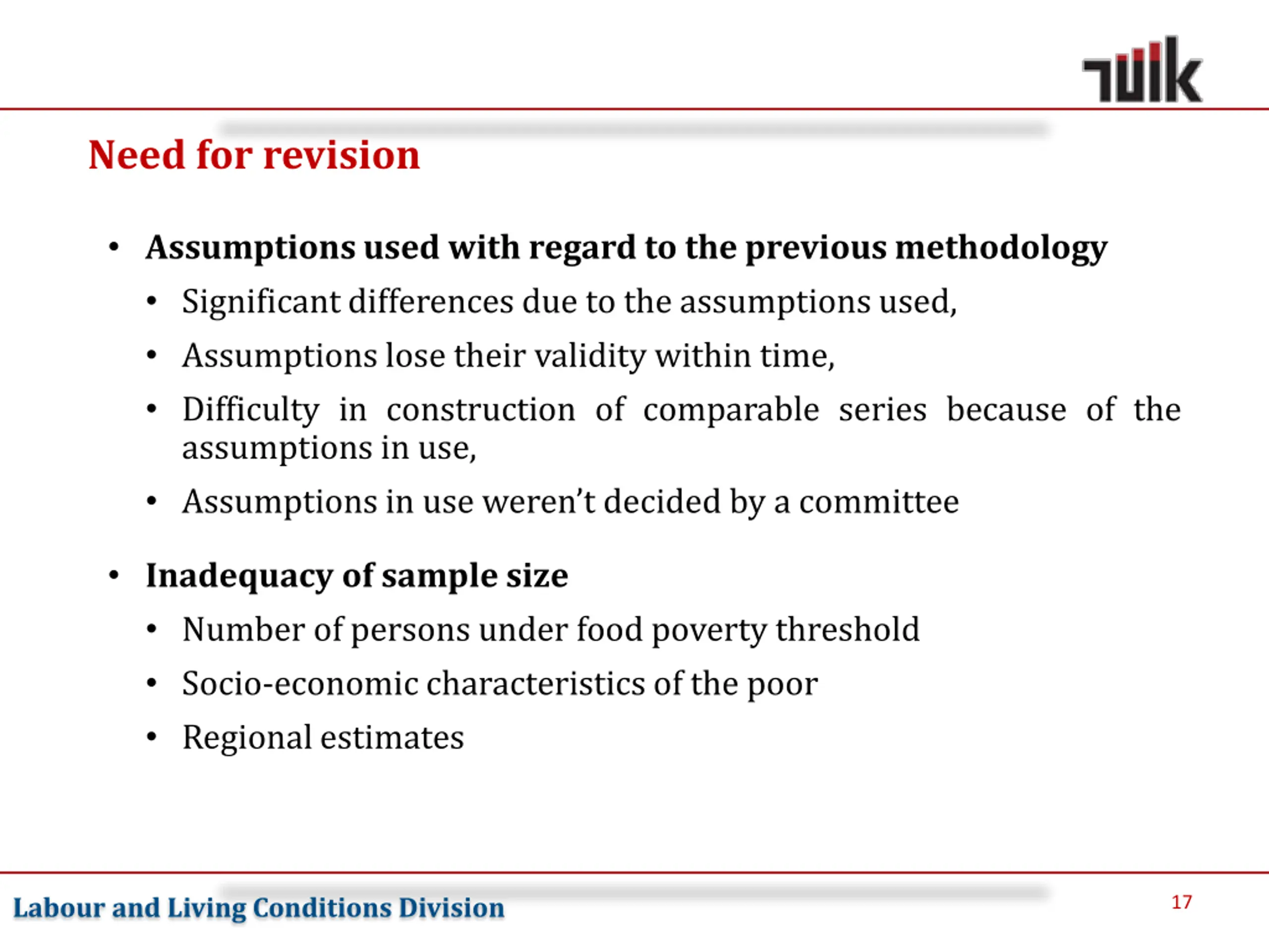 - Need for revision Assumptions used with regard to the previous methodology Significant differences due to the assumptions used, Assumptions lose their validity within time, Difficulty in construction of comparable series because of the assumptions in use, Assumptions in use weren t decided by a committee Inadequacy of sample size Number of persons under food poverty threshold Socio-economic characteristics of the poor Regional estimates Labour and Living Conditions Division 17