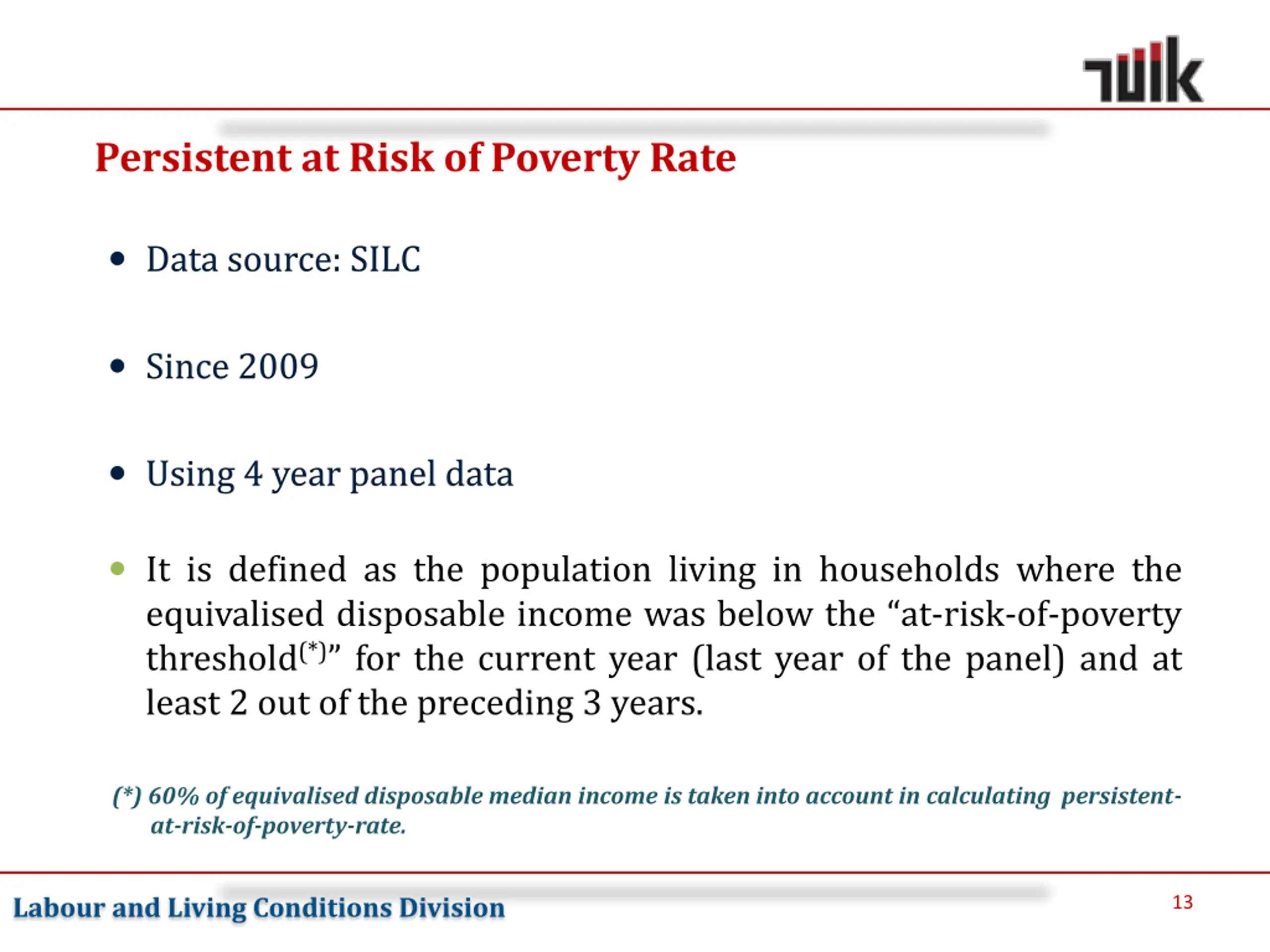 - Persistent at Risk of Poverty Rate Data source: SILC Since 2009 Using 4 year panel data It is defined as the population living in households where the equivalised disposable income was below the at-risk-of-poverty threshold(*) for the current year (last year of the panel) and at least 2 out of the preceding 3 years. (*) 60% of equivalised disposable median income is taken into account in calculating persistent- at-risk-of-poverty-rate. Labour and Living Conditions Division 13