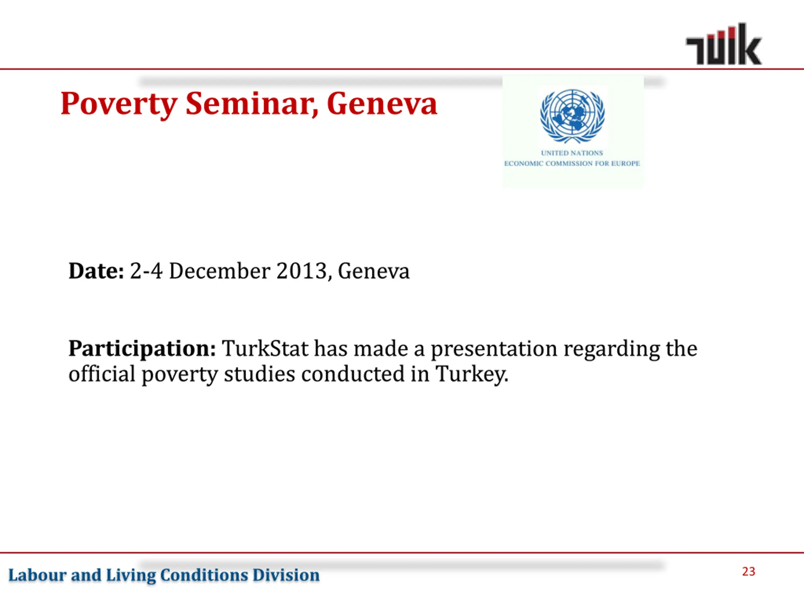 - Poverty Seminar, Geneva Date: 2-4 December 2013, Geneva Participation: TurkStat has made a presentation regarding the official poverty studies conducted in Turkey. Labour and Living Conditions Division 23
