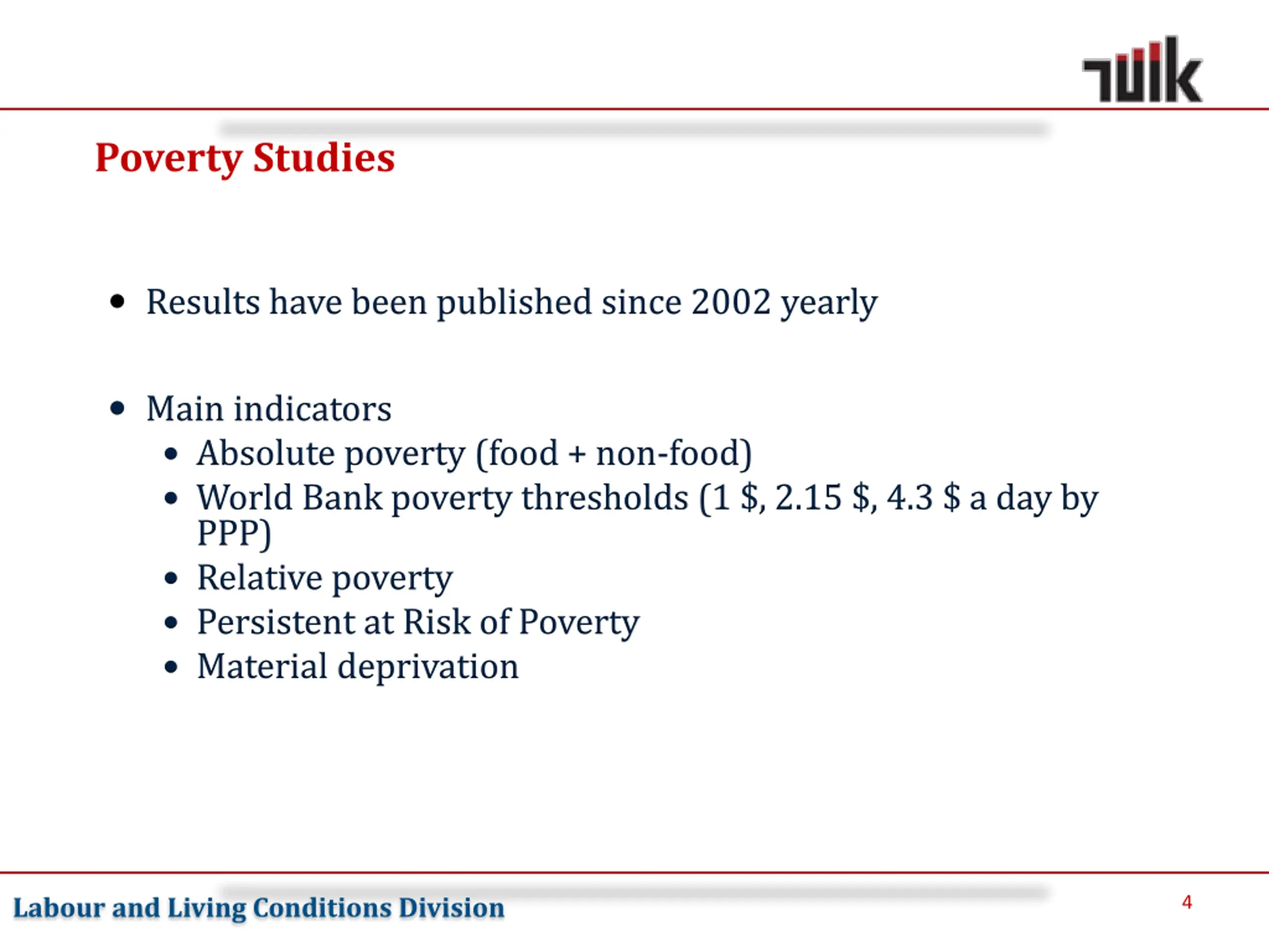 - Poverty Studies Results have been published since 2002 yearly Main indicators Absolute poverty (food + non-food) World Bank poverty thresholds (1 $, 2.15 $, 4.3 $ a day by PPP) Relative poverty Persistent at Risk of Poverty Material deprivation Labour and Living Conditions Division 4
