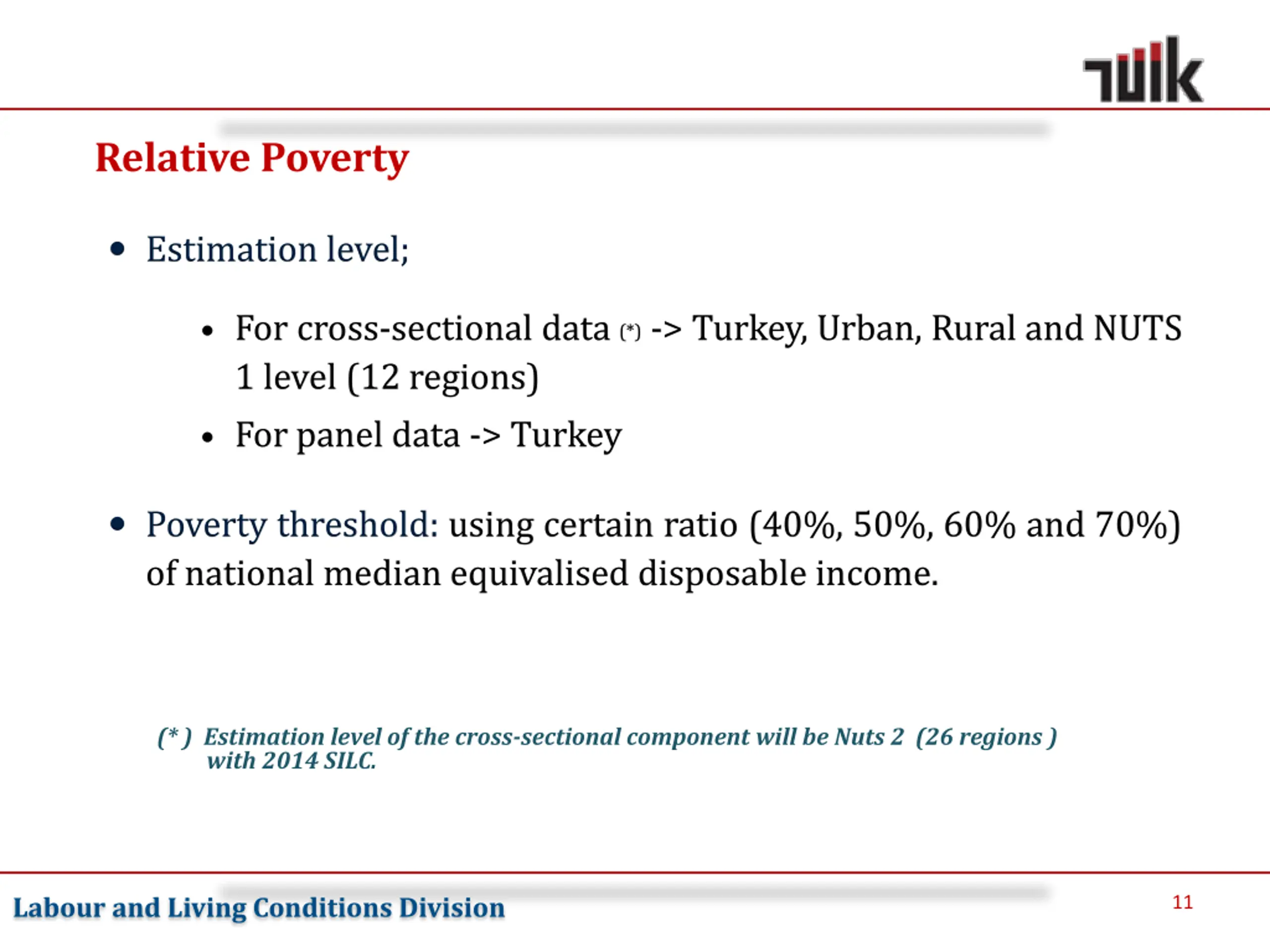 - Relative Poverty Estimation level; For cross-sectional data (*) -> Turkey, Urban, Rural and NUTS 1 level (12 regions) For panel data -> Turkey Poverty threshold: using certain ratio (40%, 50%, 60% and 70%) of national median equivalised disposable income. (* ) Estimation level of the cross-sectional component will be Nuts 2 (26 regions ) with 2014 SILC. Labour and Living Conditions Division 11