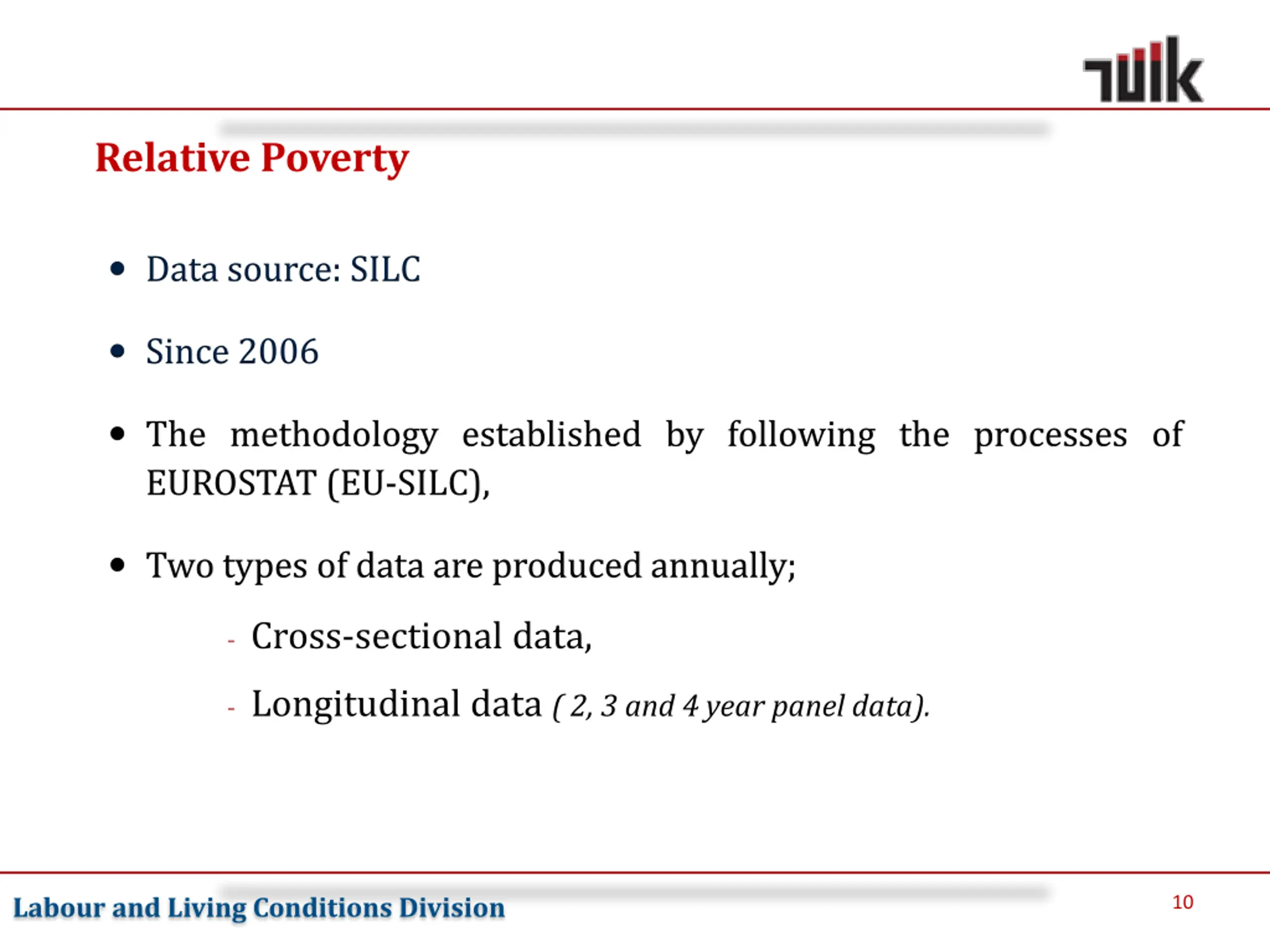 - Relative Poverty Data source: SILC Since 2006 The methodology established by following the processes of EUROSTAT (EU-SILC), Two types of data are produced annually; - Cross-sectional data, - Longitudinal data ( 2, 3 and 4 year panel data). Labour and Living Conditions Division 10
