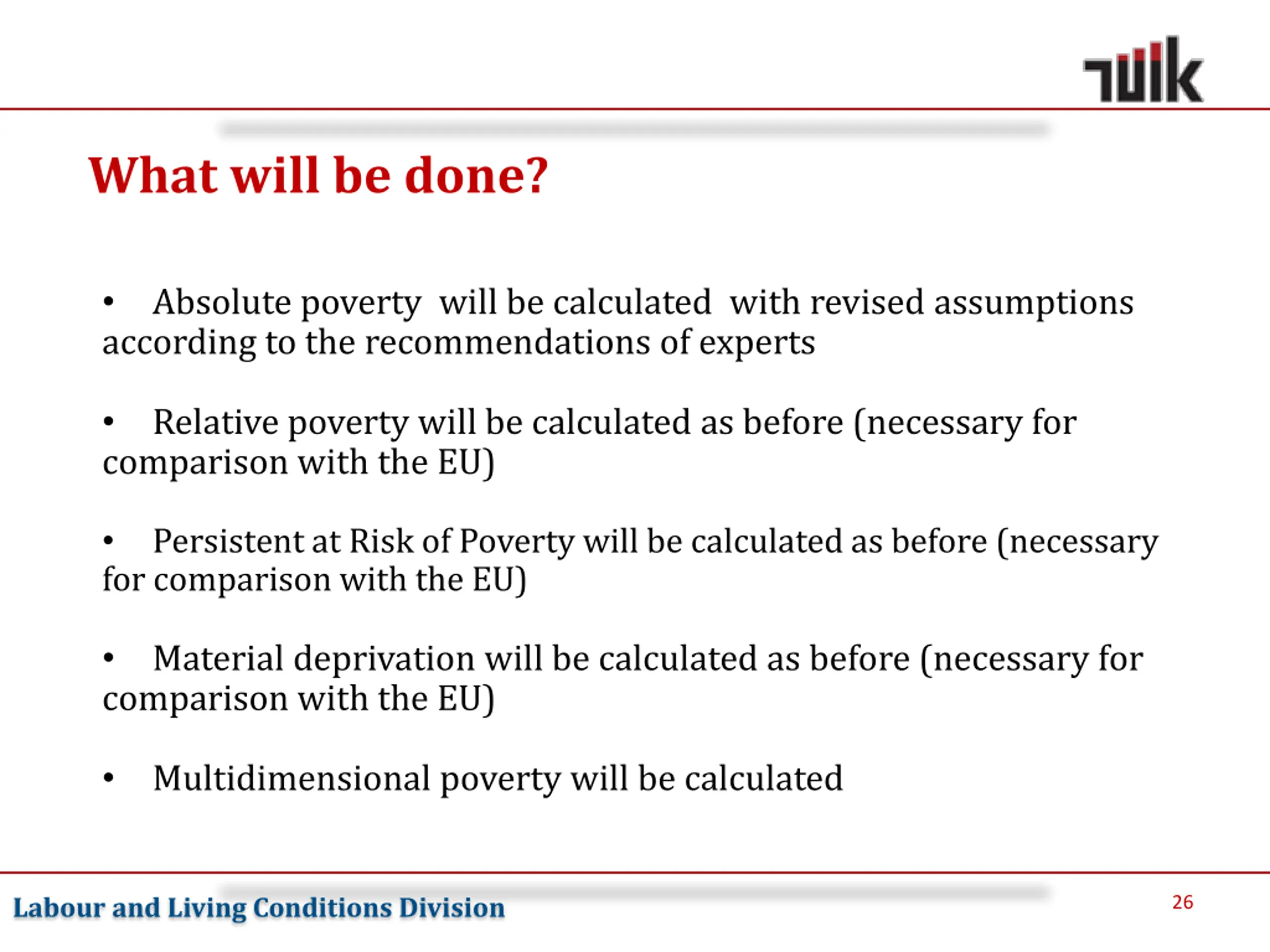 - What will be done? Absolute poverty will be calculated with revised assumptions according to the recommendations of experts Relative poverty will be calculated as before (necessary for comparison with the EU) Persistent at Risk of Poverty will be calculated as before (necessary for comparison with the EU) Material deprivation will be calculated as before (necessary for comparison with the EU) Multidimensional poverty will be calculated Labour and Living Conditions Division 26