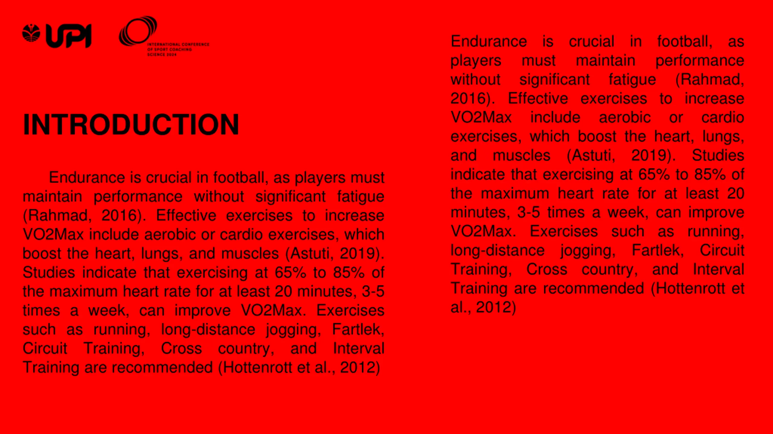 Endurance players without 2016). Effective exercises to increase VO2Max include exercises, which boost the heart, lungs, and muscles (Astuti, indicate that exercising at 65% to 85% of the maximum heart rate for at least 20 minutes, 3-5 times a week, can improve VO2Max. Exercises such as running, long-distance jogging, Training, Cross country, and Interval Training are recommended (Hottenrott et al., 2012) is crucial maintain in football, performance (Rahmad, as must significant fatigue aerobic or cardio INTRODUCTION 2019). Studies Endurance is crucial in football, as players must maintain performance without significant fatigue (Rahmad, 2016). Effective exercises to increase VO2Max include aerobic or cardio exercises, which boost the heart, lungs, and muscles (Astuti, 2019). Studies indicate that exercising at 65% to 85% of the maximum heart rate for at least 20 minutes, 3-5 times a week, can improve VO2Max. Exercises such as running, long-distance jogging, Fartlek, Circuit Training, Cross Training are recommended (Hottenrott et al., 2012) Fartlek, Circuit country, and Interval