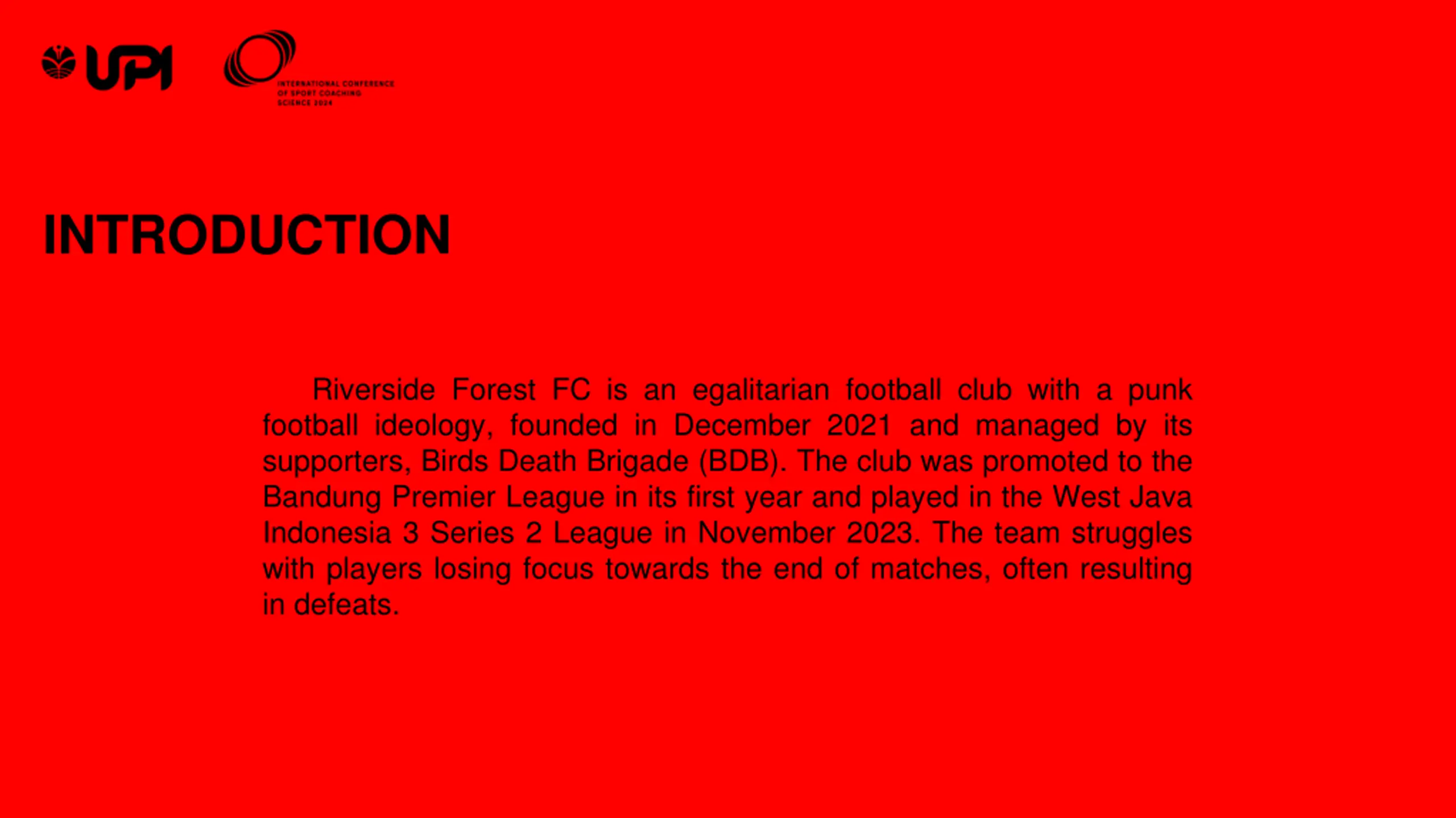 INTRODUCTION Riverside Forest FC is an egalitarian football club with a punk football ideology, founded in December 2021 and managed by its supporters, Birds Death Brigade (BDB). The club was promoted to the Bandung Premier League in its first year and played in the West Java Indonesia 3 Series 2 League in November 2023. The team struggles with players losing focus towards the end of matches, often resulting in defeats.