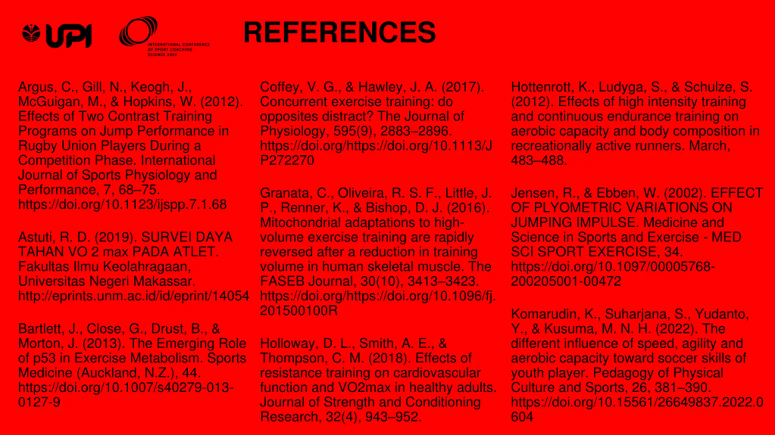 REFERENCES Argus, C., Gill, N., Keogh, J., McGuigan, M., & Hopkins, W. (2012). Effects of Two Contrast Training Programs on Jump Performance in Rugby Union Players During a Competition Phase. International Journal of Sports Physiology and Performance, 7, 68 75. https://doi.org/10.1123/ijspp.7.1.68 Coffey, V. G., & Hawley, J. A. (2017). Concurrent exercise training: do opposites distract? The Journal of Physiology, 595(9), 2883 2896. https://doi.org/https://doi.org/10.1113/J P272270 Hottenrott, K., Ludyga, S., & Schulze, S. (2012). Effects of high intensity training and continuous endurance training on aerobic capacity and body composition in recreationally active runners. March, 483 488. Granata, C., Oliveira, R. S. F., Little, J. P., Renner, K., & Bishop, D. J. (2016). Mitochondrial adaptations to high- volume exercise training are rapidly reversed after a reduction in training volume in human skeletal muscle. The FASEB Journal, 30(10), 3413 3423. https://doi.org/https://doi.org/10.1096/fj. 201500100R Jensen, R., & Ebben, W. (2002). EFFECT OF PLYOMETRIC VARIATIONS ON JUMPING IMPULSE. Medicine and Science in Sports and Exercise - MED SCI SPORT EXERCISE, 34. https://doi.org/10.1097/00005768- 200205001-00472 Astuti, R. D. (2019). SURVEI DAYA TAHAN VO 2 max PADA ATLET. Fakultas Ilmu Keolahragaan, Universitas Negeri Makassar. http://eprints.unm.ac.id/id/eprint/14054 Komarudin, K., Suharjana, S., Yudanto, Y., & Kusuma, M. N. H. (2022). The different influence of speed, agility and aerobic capacity toward soccer skills of youth player. Pedagogy of Physical Culture and Sports, 26, 381 390. https://doi.org/10.15561/26649837.2022.0 604 Bartlett, J., Close, G., Drust, B., & Morton, J. (2013). The Emerging Role of p53 in Exercise Metabolism. Sports Medicine (Auckland, N.Z.), 44. https://doi.org/10.1007/s40279-013- 0127-9 Holloway, D. L., Smith, A. E., & Thompson, C. M. (2018). Effects of resistance training on cardiovascular function and VO2max in healthy adults. Journal of Strength and Conditioning Research, 32(4), 943 952.