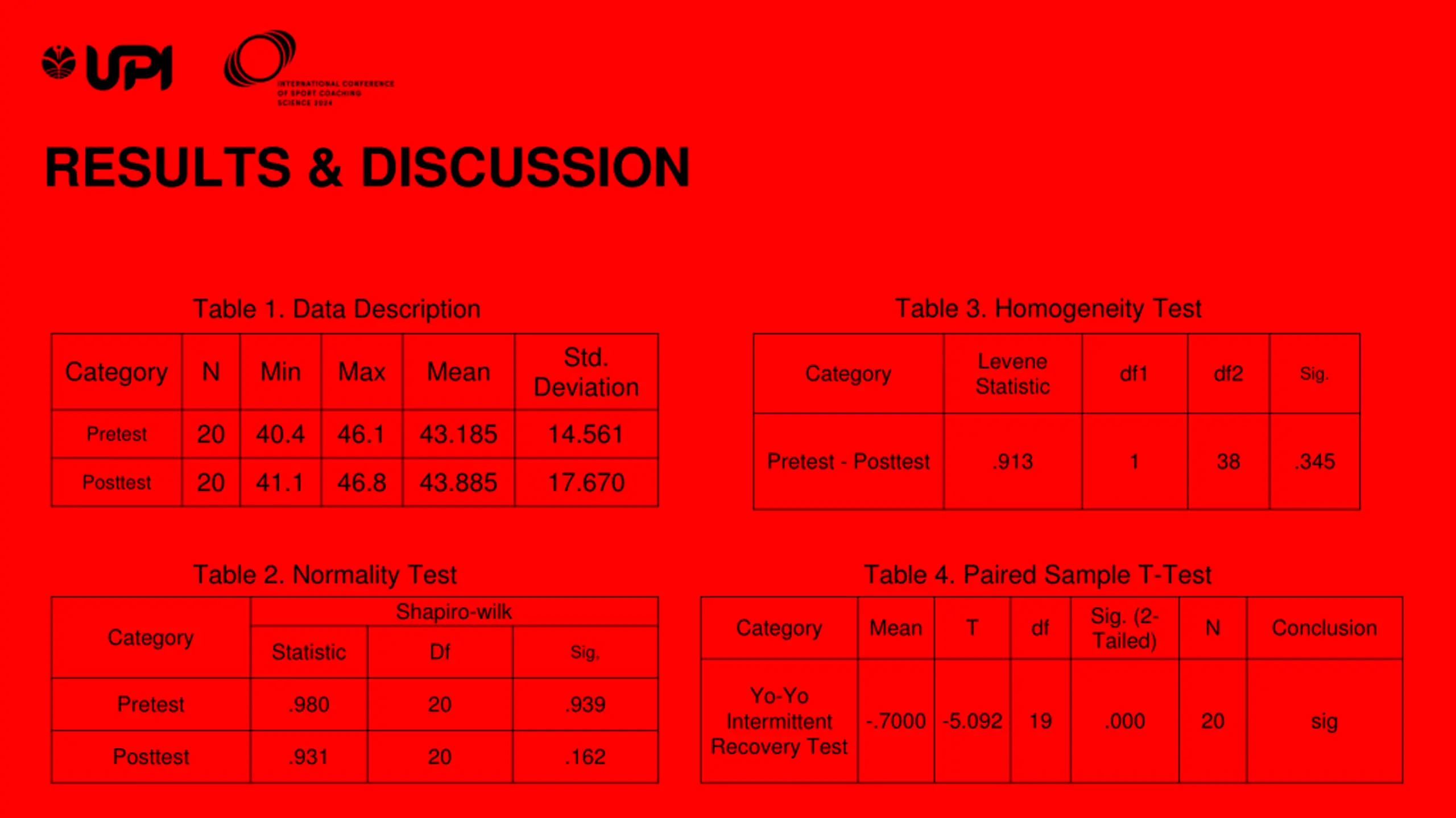 RESULTS & DISCUSSION Table 3. Homogeneity Test Table 1. Data Description Std. Levene Statistic Category N Min Max Mean Category df1 df2 Sig. Deviation 20 40.4 46.1 43.185 14.561 Pretest Pretest - Posttest .913 1 38 .345 20 41.1 46.8 43.885 17.670 Posttest Table 2. Normality Test Table 4. Paired Sample T-Test Shapiro-wilk Sig. (2- Tailed) Category Mean T df N Conclusion Category Statistic Df Sig, Yo-Yo Intermittent Recovery Test Pretest .980 20 .939 -.7000 -5.092 19 .000 20 sig Posttest .931 20 .162