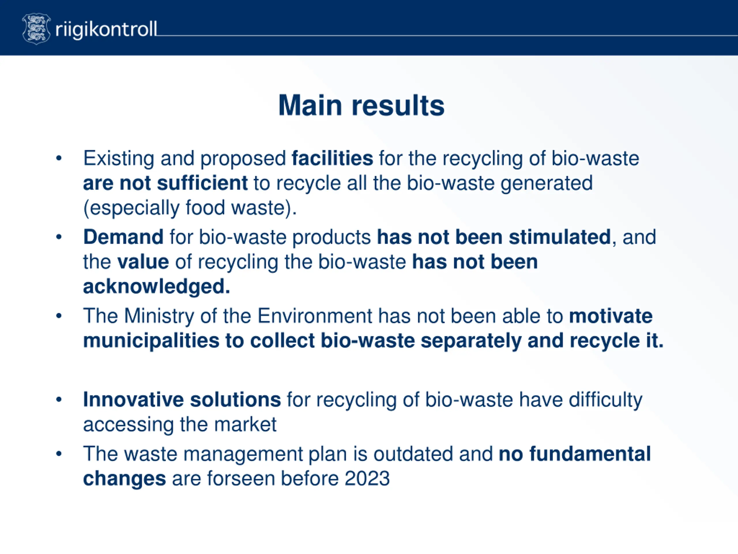 Main results Existing and proposed facilities for the recycling of bio-waste are not sufficient to recycle all the bio-waste generated (especially food waste). Demand for bio-waste products has not been stimulated, and the value of recycling the bio-waste has not been acknowledged. The Ministry of the Environment has not been able to motivate municipalities to collect bio-waste separately and recycle it. Innovative solutions for recycling of bio-waste have difficulty accessing the market The waste management plan is outdated and no fundamental changes are forseen before 2023