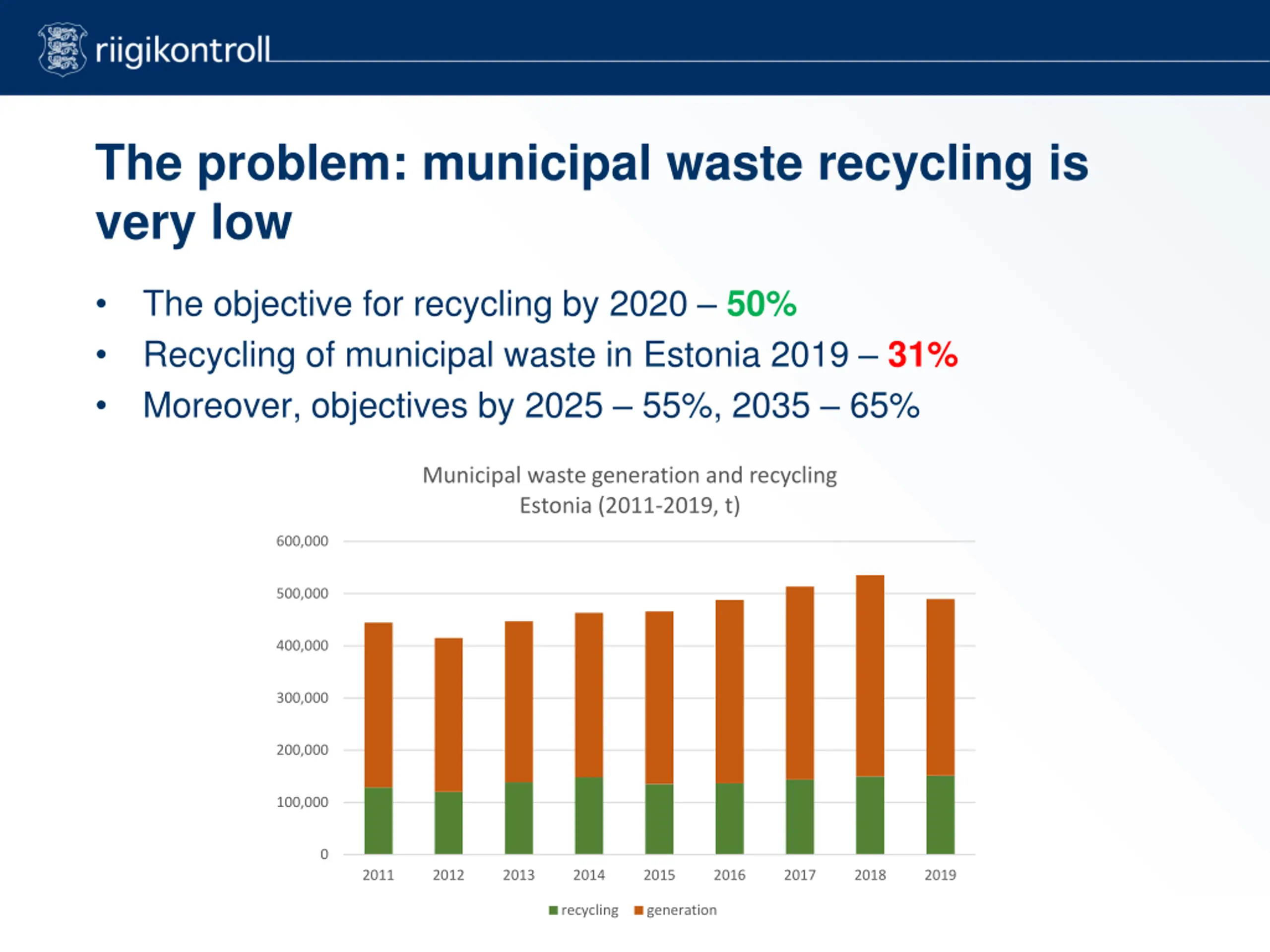 The problem: municipal waste recycling is very low The objective for recycling by 2020 50% Recycling of municipal waste in Estonia 2019 31% Moreover, objectives by 2025 55%, 2035 65% Municipal waste generation and recycling Estonia (2011-2019, t) 600,000 500,000 400,000 300,000 200,000 100,000 0 2011 2012 2013 2014 2015 2016 2017 2018 2019 recycling generation