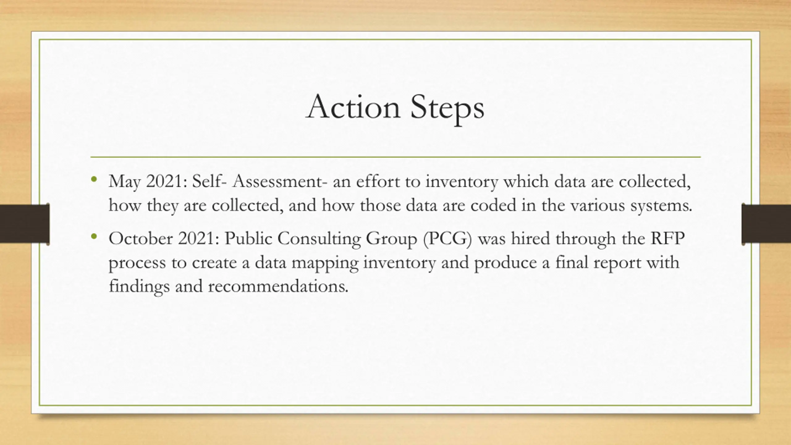 Action Steps May 2021: Self- Assessment- an effort to inventory which data are collected, how they are collected, and how those data are coded in the various systems. October 2021: Public Consulting Group (PCG) was hired through the RFP process to create a data mapping inventory and produce a final report with findings and recommendations.