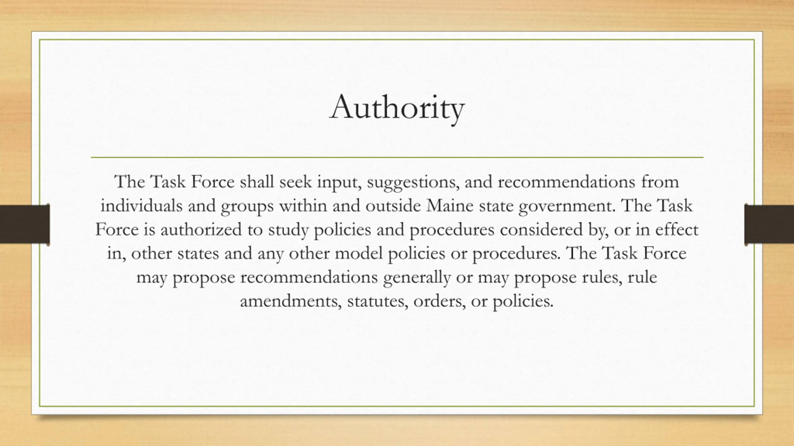 Authority The Task Force shall seek input, suggestions, and recommendations from individuals and groups within and outside Maine state government. The Task Force is authorized to study policies and procedures considered by, or in effect in, other states and any other model policies or procedures. The Task Force may propose recommendations generally or may propose rules, rule amendments, statutes, orders, or policies.