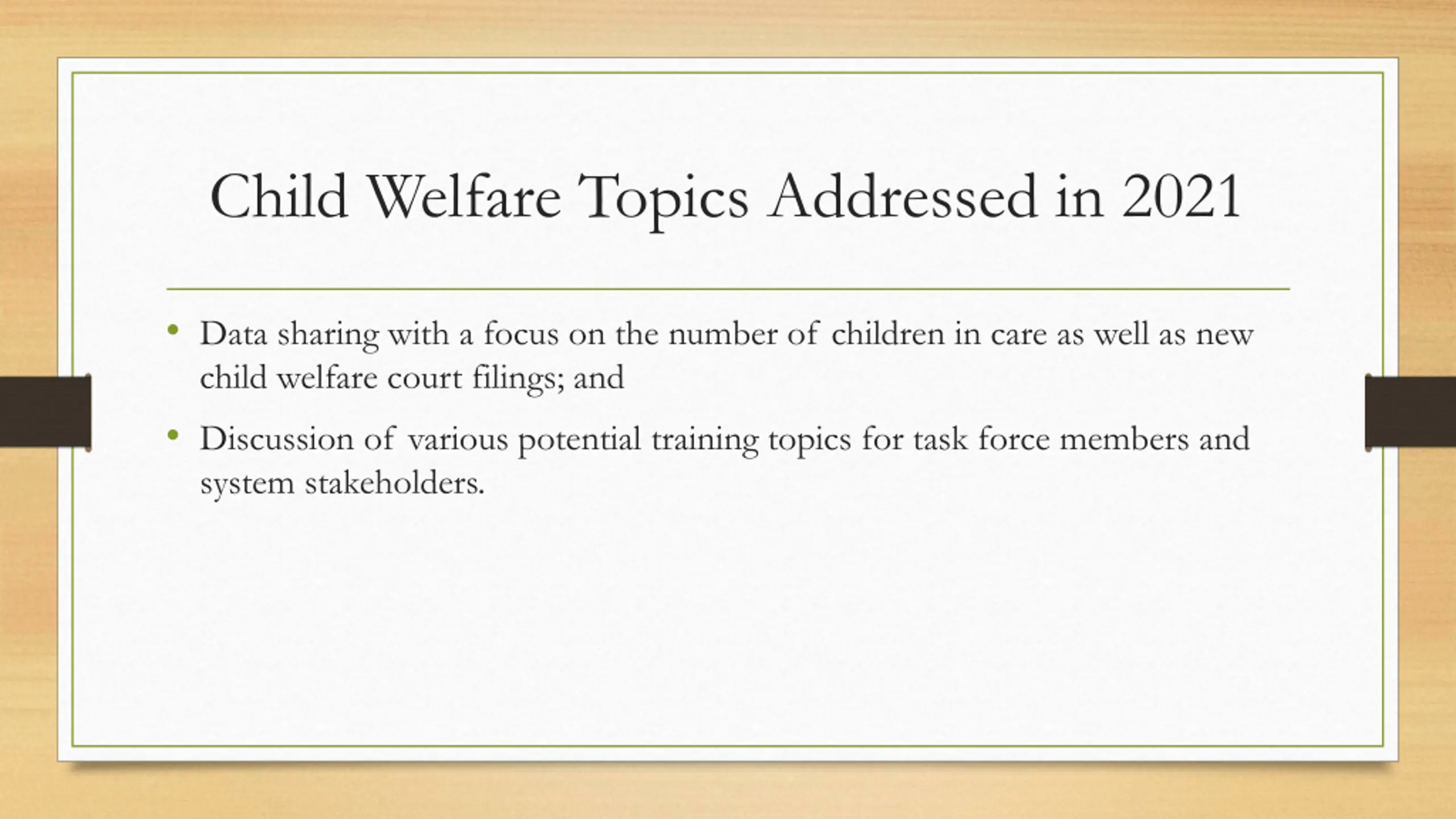 Child Welfare Topics Addressed in 2021 Data sharing with a focus on the number of children in care as well as new child welfare court filings; and Discussion of various potential training topics for task force members and system stakeholders.