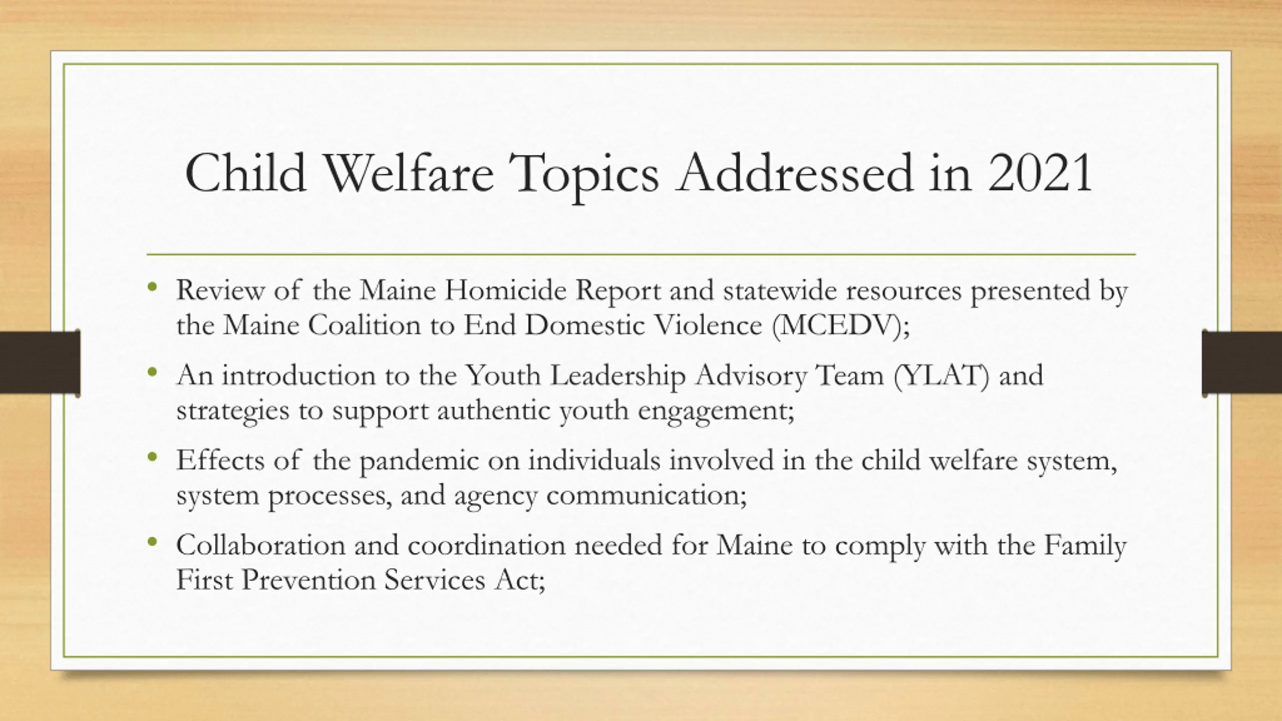 Child Welfare Topics Addressed in 2021 Review of the Maine Homicide Report and statewide resources presented by the Maine Coalition to End Domestic Violence (MCEDV); An introduction to the Youth Leadership Advisory Team (YLAT) and strategies to support authentic youth engagement; Effects of the pandemic on individuals involved in the child welfare system, system processes, and agency communication; Collaboration and coordination needed for Maine to comply with the Family First Prevention Services Act;