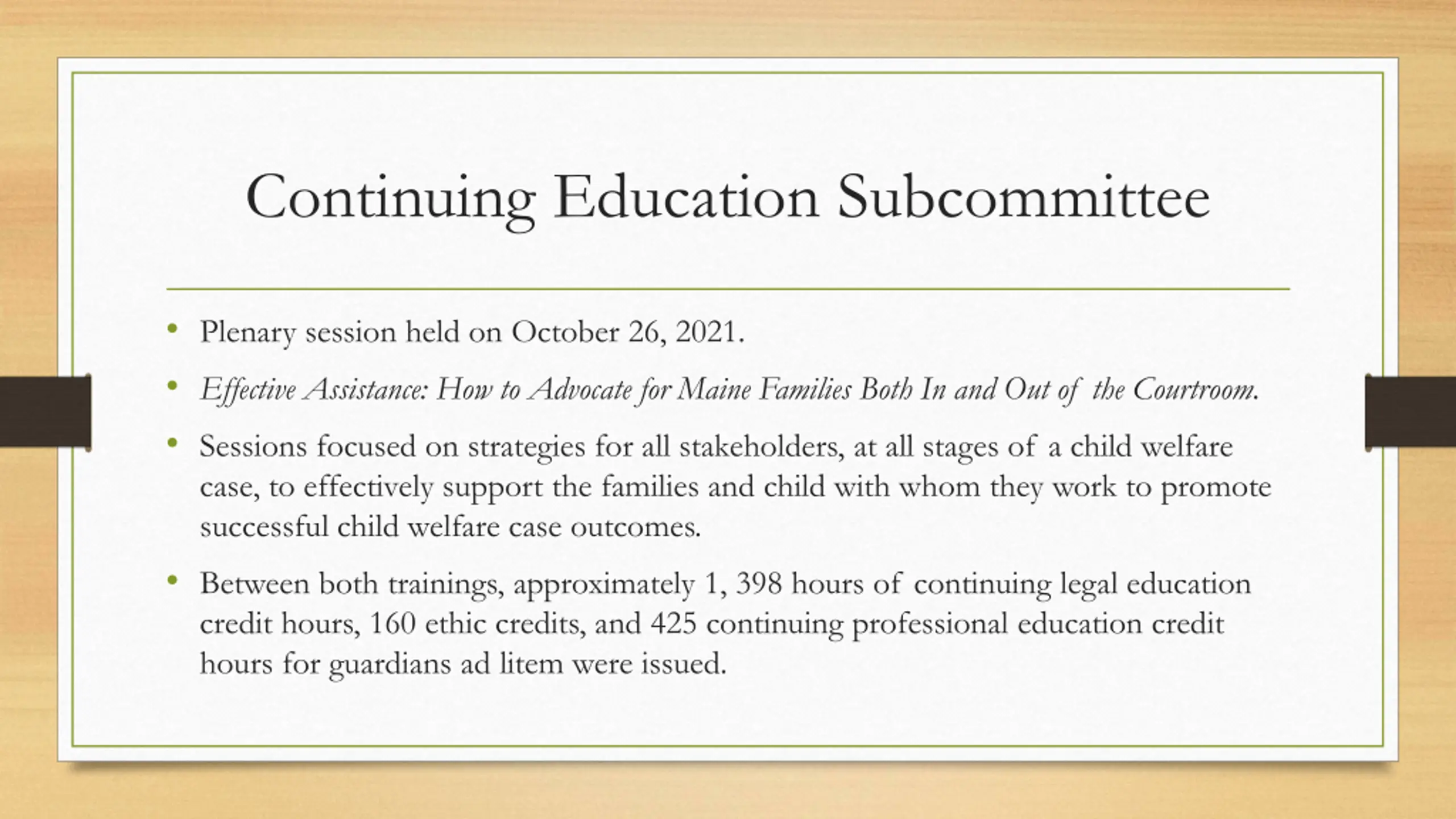 Continuing Education Subcommittee Plenary session held on October 26, 2021. Effective Assistance: How to Advocate for Maine Families Both In and Out of the Courtroom. Sessions focused on strategies for all stakeholders, at all stages of a child welfare case, to effectively support the families and child with whom they work to promote successful child welfare case outcomes. Between both trainings, approximately 1, 398 hours of continuing legal education credit hours, 160 ethic credits, and 425 continuing professional education credit hours for guardians ad litem were issued.
