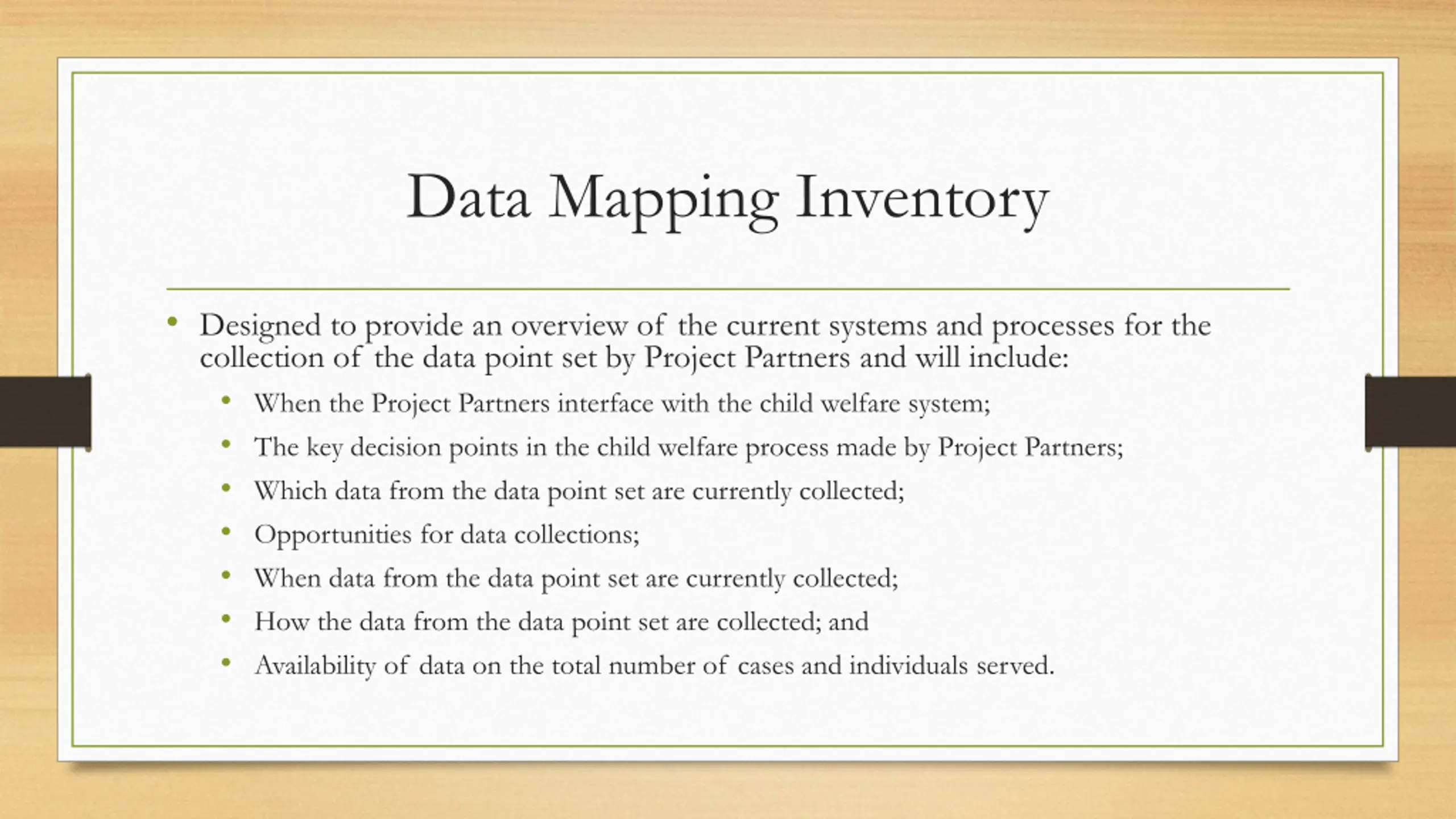 Data Mapping Inventory Designed to provide an overview of the current systems and processes for the collection of the data point set by Project Partners and will include: When the Project Partners interface with the child welfare system; The key decision points in the child welfare process made by Project Partners; Which data from the data point set are currently collected; Opportunities for data collections; When data from the data point set are currently collected; How the data from the data point set are collected; and Availability of data on the total number of cases and individuals served.