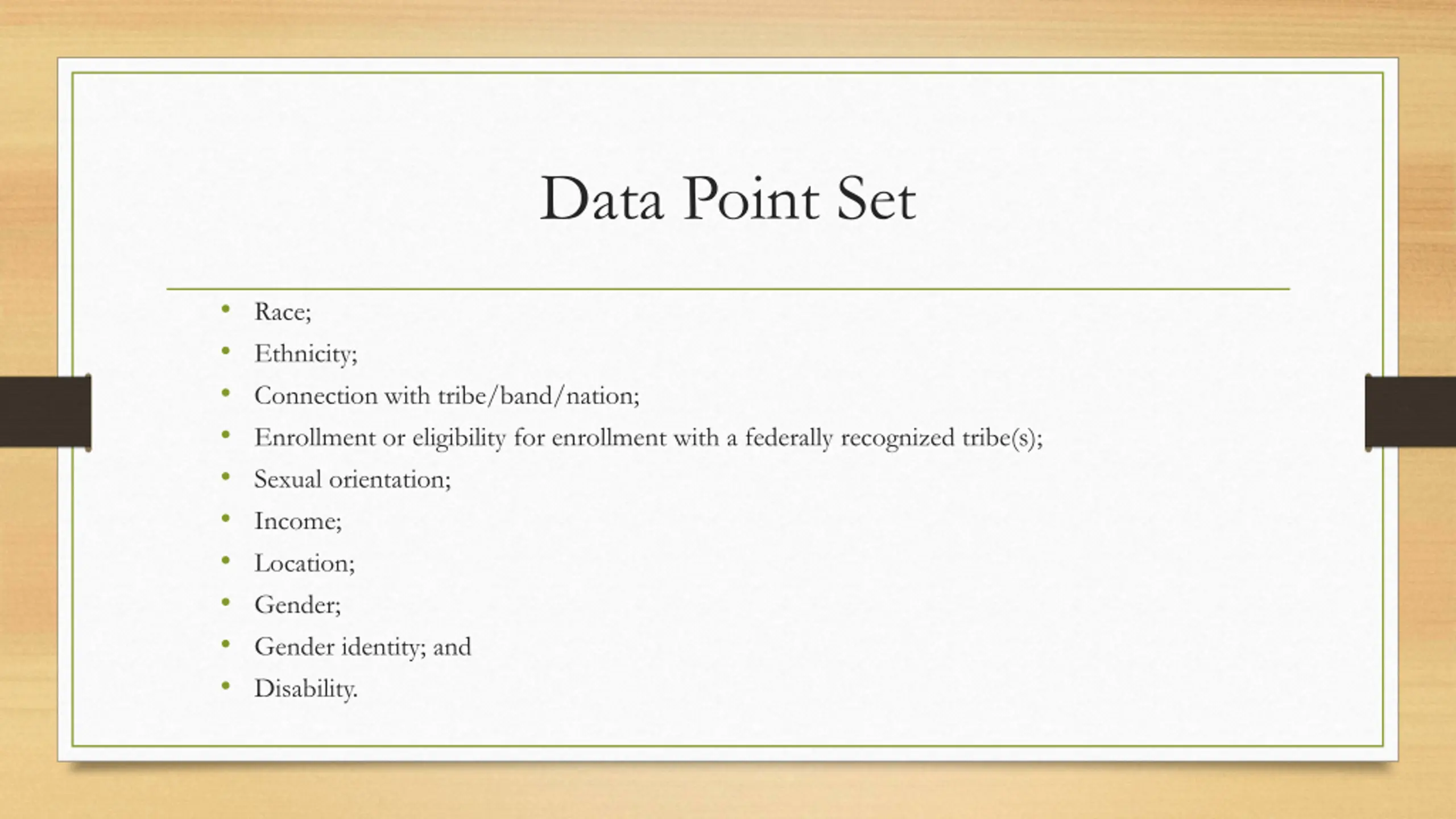 Data Point Set Race; Ethnicity; Connection with tribe/band/nation; Enrollment or eligibility for enrollment with a federally recognized tribe(s); Sexual orientation; Income; Location; Gender; Gender identity; and Disability.