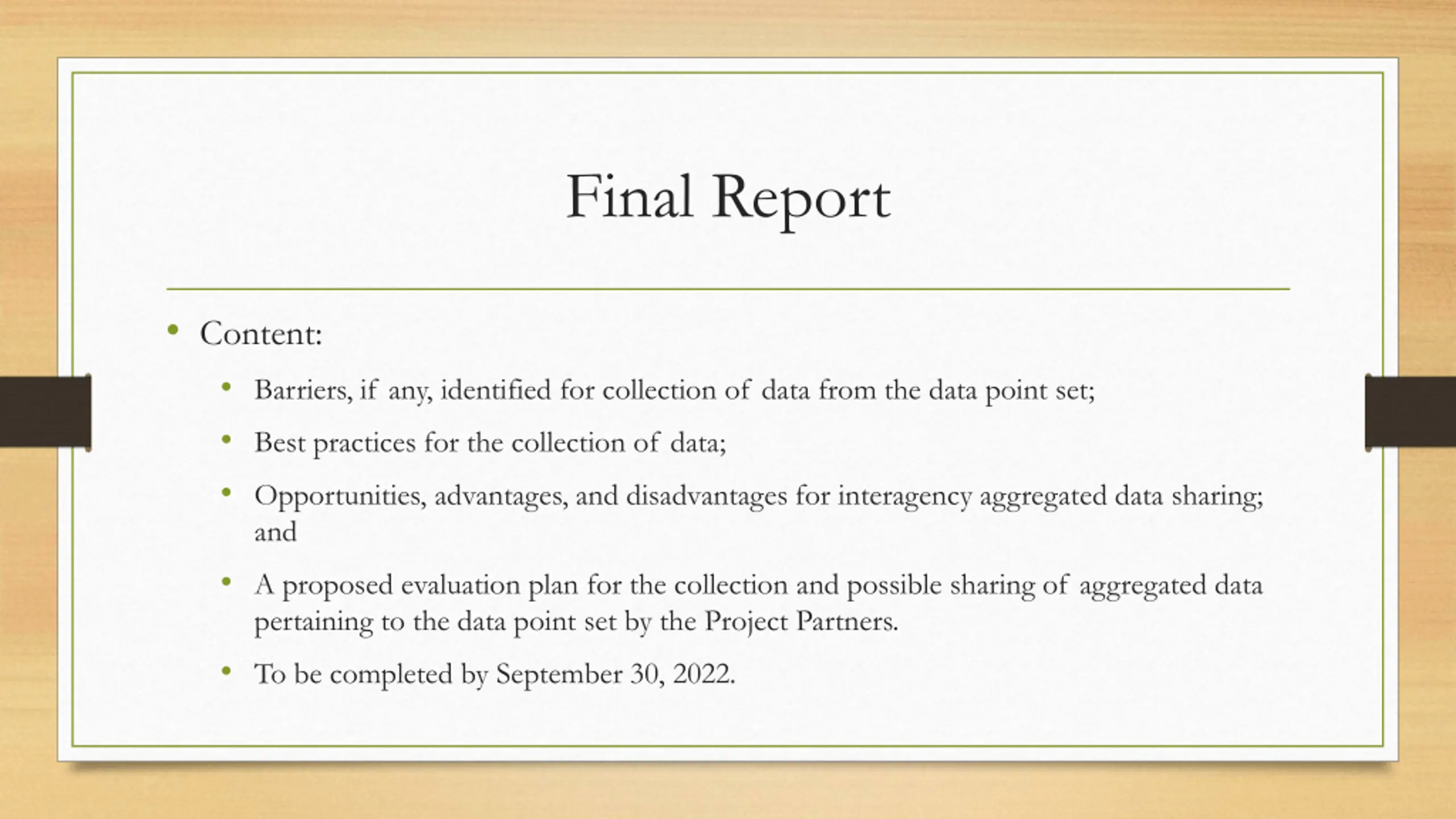Final Report Content: Barriers, if any, identified for collection of data from the data point set; Best practices for the collection of data; Opportunities, advantages, and disadvantages for interagency aggregated data sharing; and A proposed evaluation plan for the collection and possible sharing of aggregated data pertaining to the data point set by the Project Partners. To be completed by September 30, 2022.