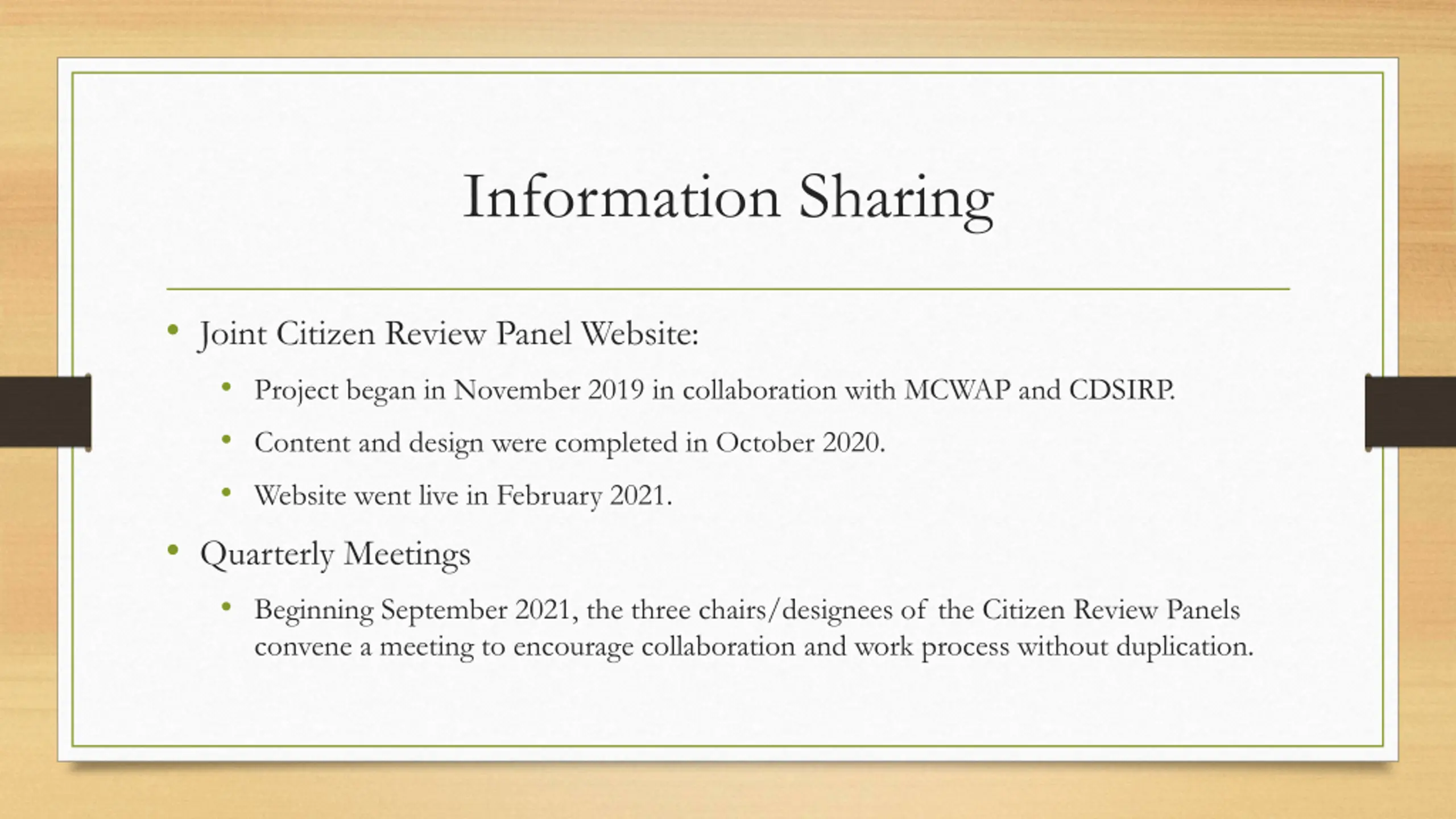 Information Sharing Joint Citizen Review Panel Website: Project began in November 2019 in collaboration with MCWAP and CDSIRP. Content and design were completed in October 2020. Website went live in February 2021. Quarterly Meetings Beginning September 2021, the three chairs/designees of the Citizen Review Panels convene a meeting to encourage collaboration and work process without duplication.