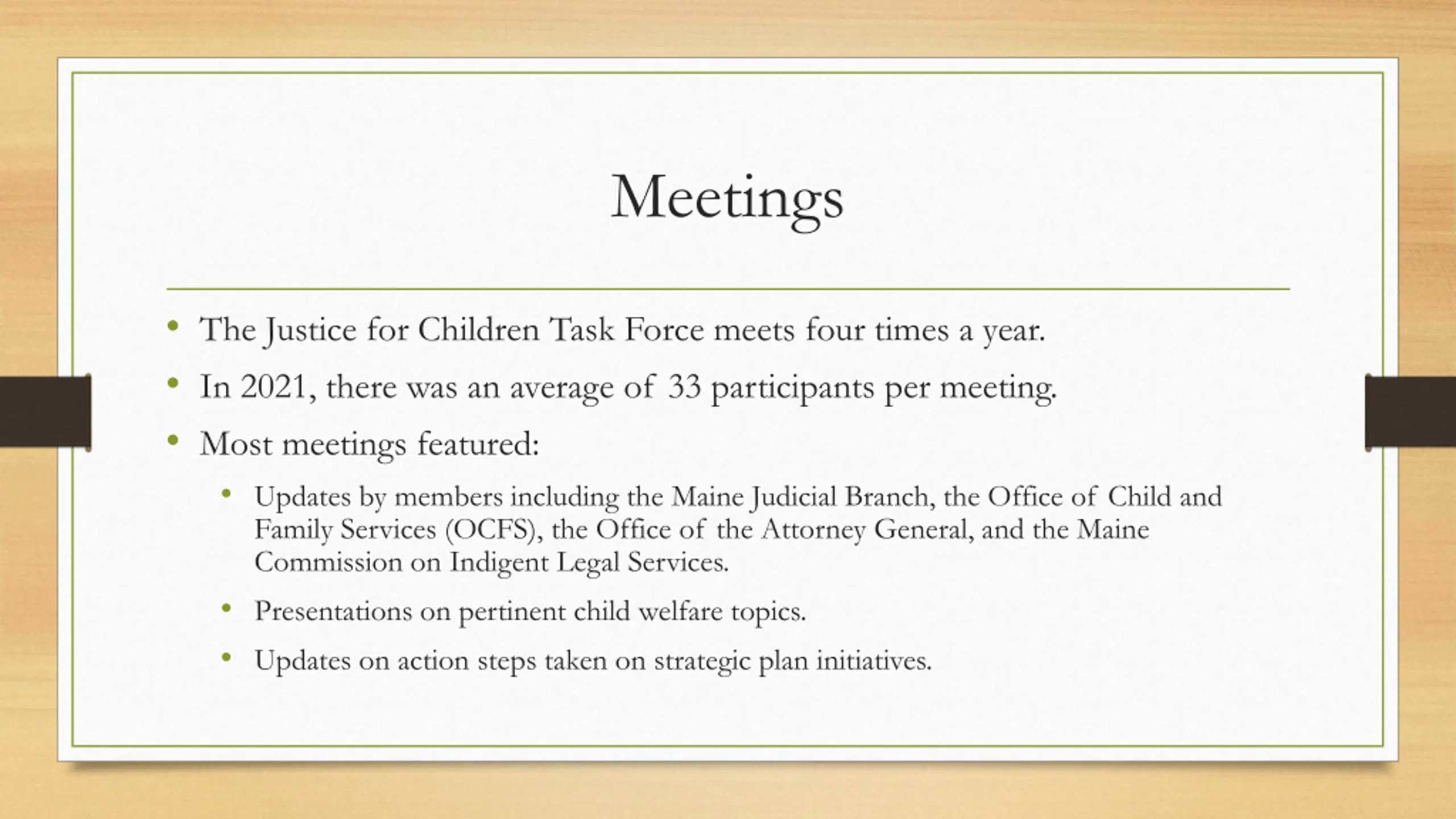 Meetings The Justice for Children Task Force meets four times a year. In 2021, there was an average of 33 participants per meeting. Most meetings featured: Updates by members including the Maine Judicial Branch, the Office of Child and Family Services (OCFS), the Office of the Attorney General, and the Maine Commission on Indigent Legal Services. Presentations on pertinent child welfare topics. Updates on action steps taken on strategic plan initiatives.