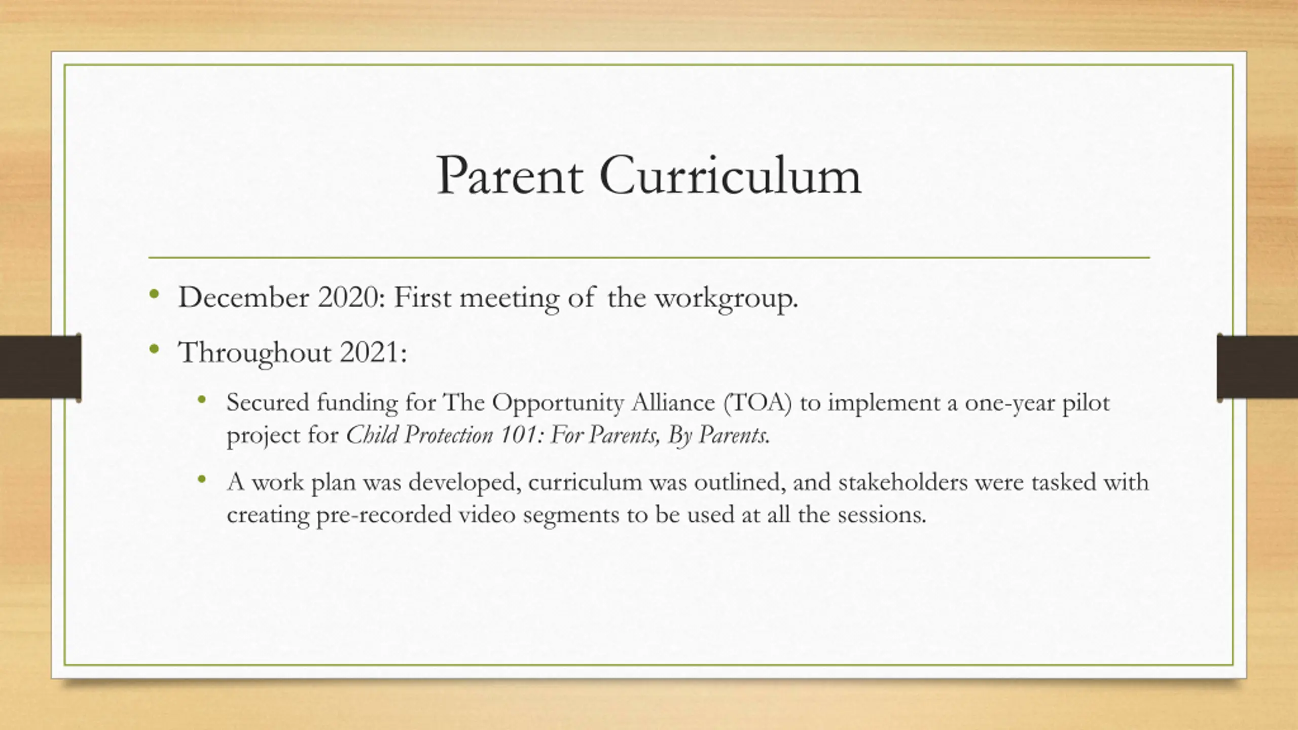 Parent Curriculum December 2020: First meeting of the workgroup. Throughout 2021: Secured funding for The Opportunity Alliance (TOA) to implement a one-year pilot project for Child Protection 101: For Parents, By Parents. A work plan was developed, curriculum was outlined, and stakeholders were tasked with creating pre-recorded video segments to be used at all the sessions.