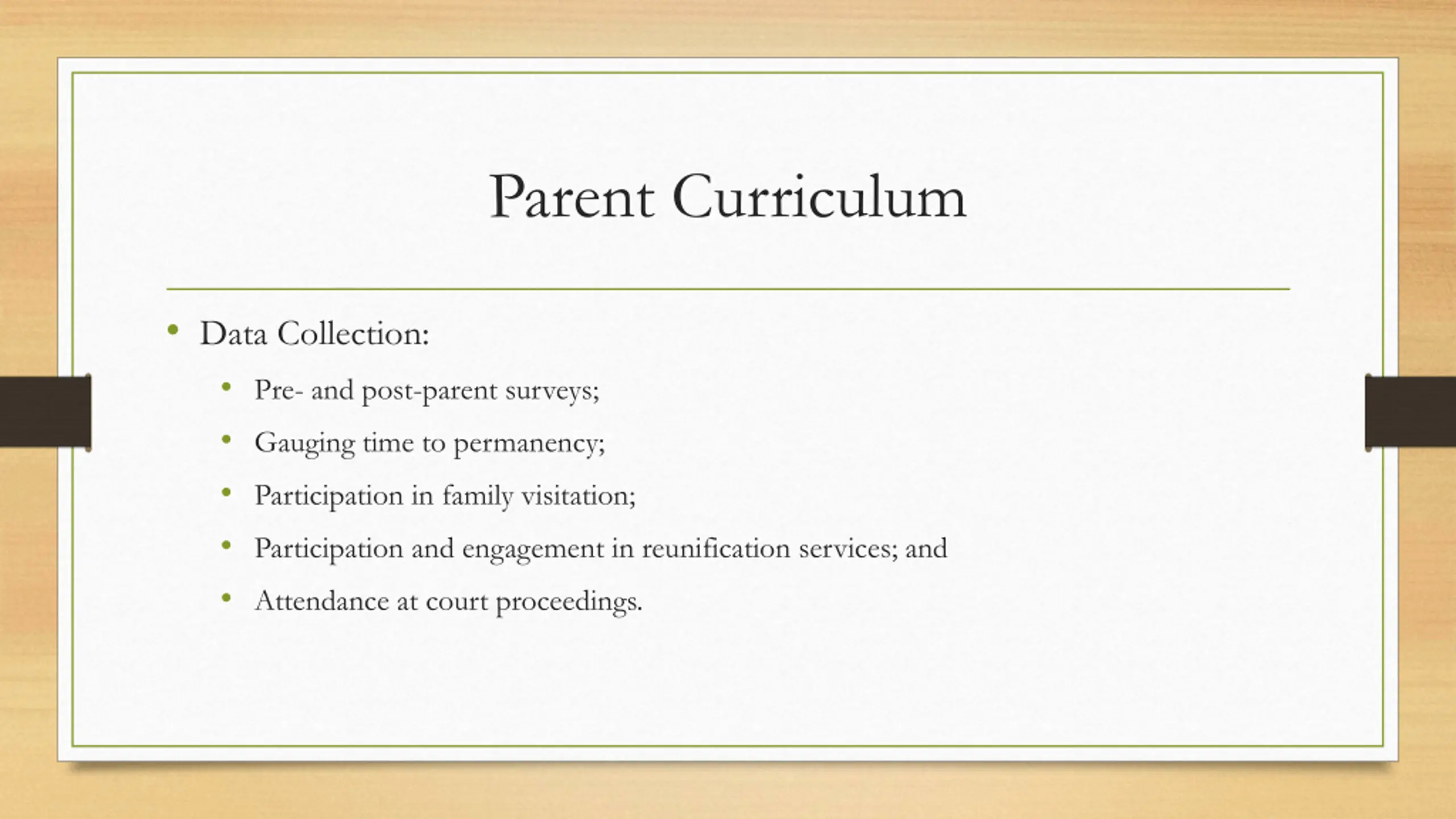 Parent Curriculum Data Collection: Pre- and post-parent surveys; Gauging time to permanency; Participation in family visitation; Participation and engagement in reunification services; and Attendance at court proceedings.