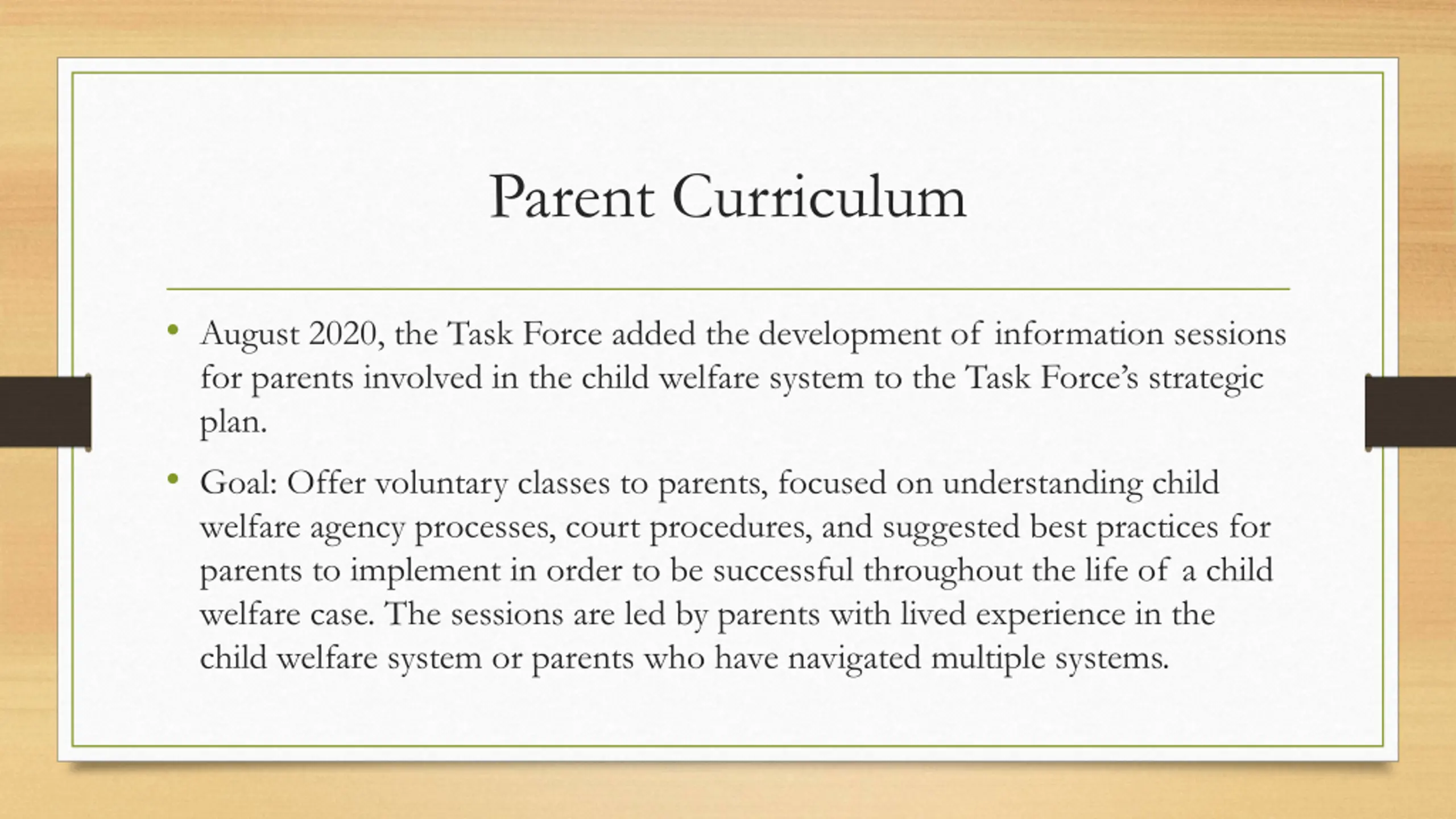 Parent Curriculum August 2020, the Task Force added the development of information sessions for parents involved in the child welfare system to the Task Force s strategic plan. Goal: Offer voluntary classes to parents, focused on understanding child welfare agency processes, court procedures, and suggested best practices for parents to implement in order to be successful throughout the life of a child welfare case. The sessions are led by parents with lived experience in the child welfare system or parents who have navigated multiple systems.