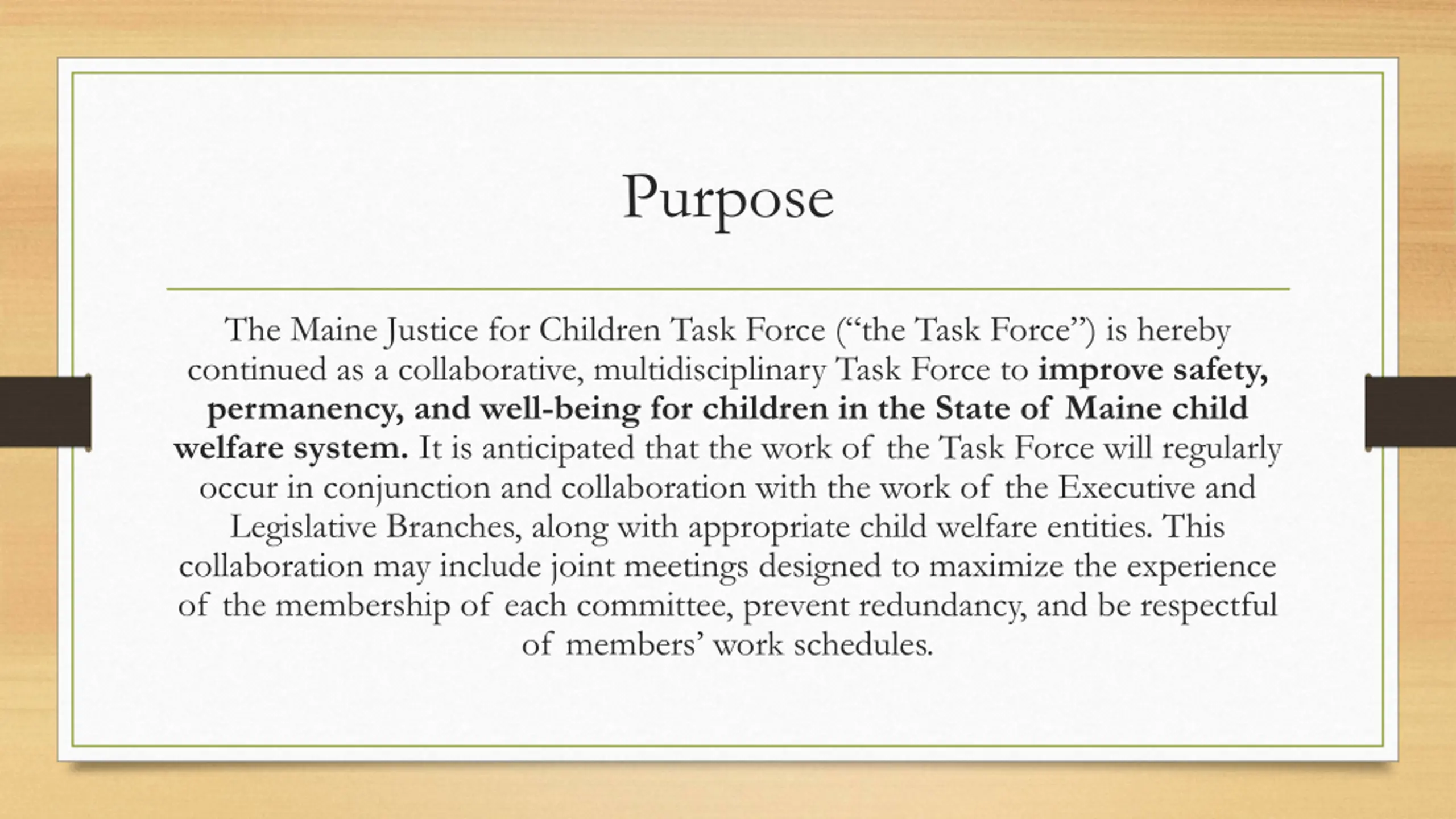 Purpose The Maine Justice for Children Task Force ( the Task Force ) is hereby continued as a collaborative, multidisciplinary Task Force to improve safety, permanency, and well-being for children in the State of Maine child welfare system. It is anticipated that the work of the Task Force will regularly occur in conjunction and collaboration with the work of the Executive and Legislative Branches, along with appropriate child welfare entities. This collaboration may include joint meetings designed to maximize the experience of the membership of each committee, prevent redundancy, and be respectful of members work schedules.