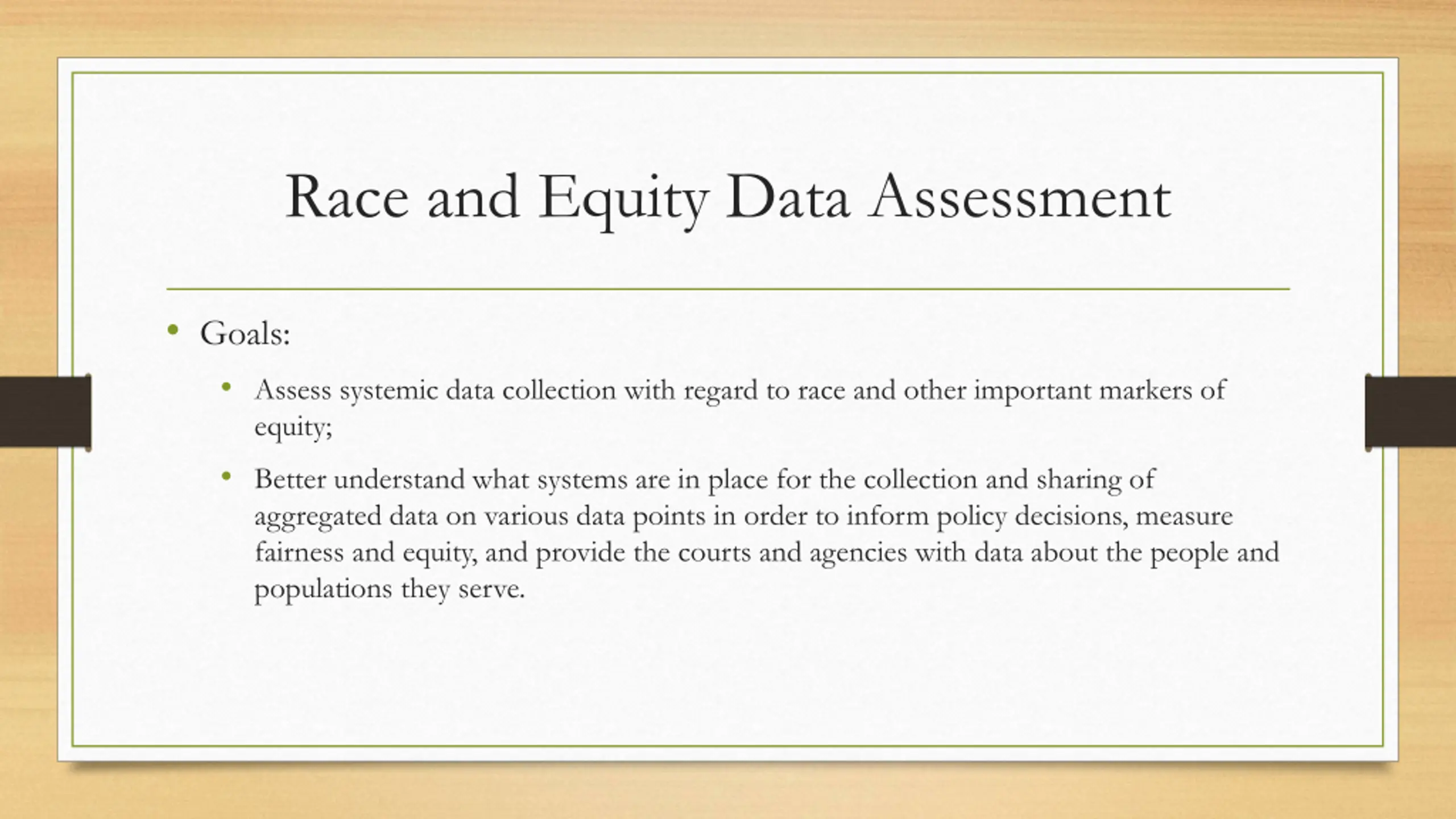 Race and Equity Data Assessment Goals: Assess systemic data collection with regard to race and other important markers of equity; Better understand what systems are in place for the collection and sharing of aggregated data on various data points in order to inform policy decisions, measure fairness and equity, and provide the courts and agencies with data about the people and populations they serve.