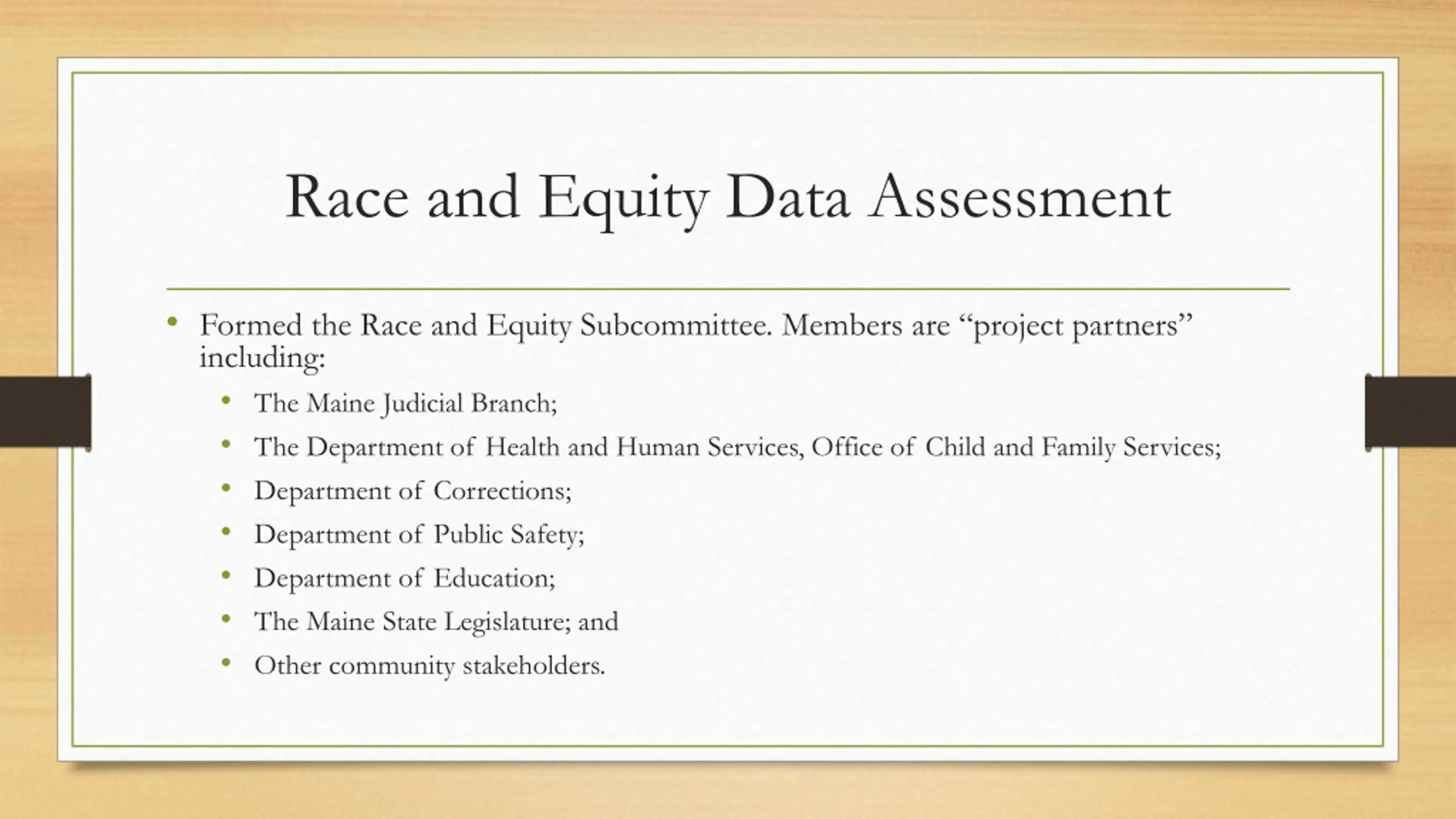 Race and Equity Data Assessment Formed the Race and Equity Subcommittee. Members are project partners including: The Maine Judicial Branch; The Department of Health and Human Services, Office of Child and Family Services; Department of Corrections; Department of Public Safety; Department of Education; The Maine State Legislature; and Other community stakeholders.