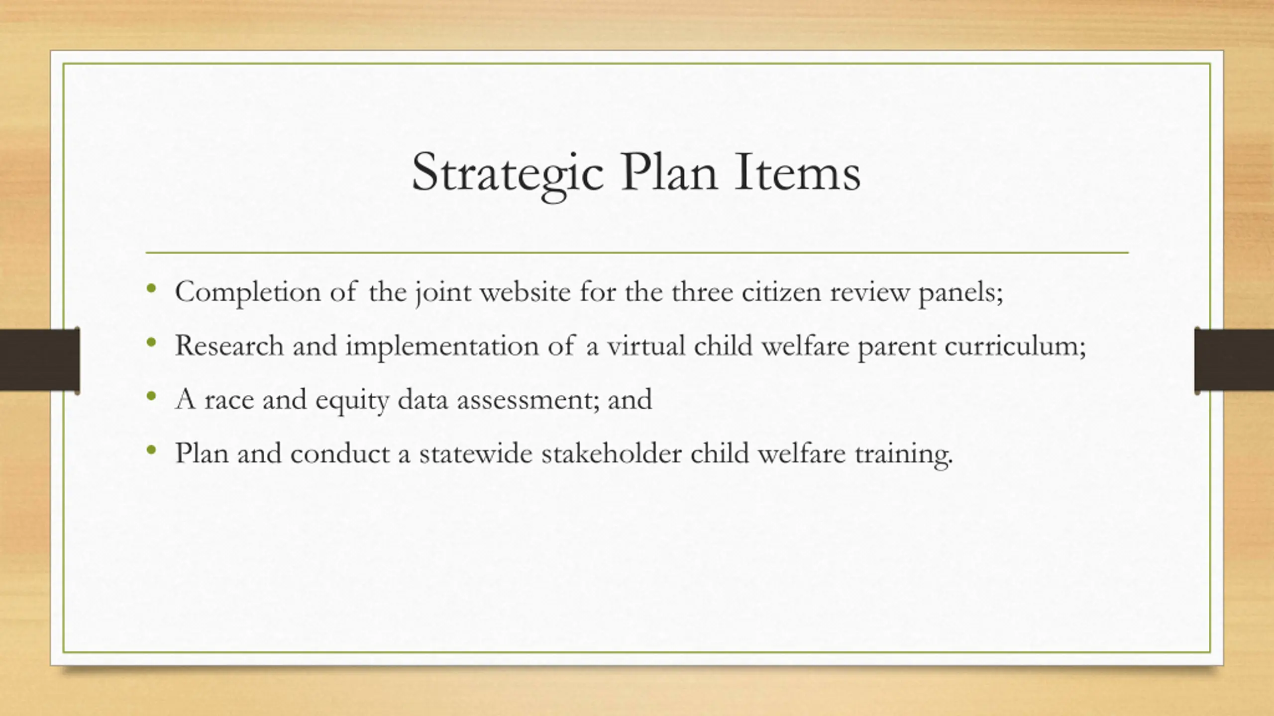 Strategic Plan Items Completion of the joint website for the three citizen review panels; Research and implementation of a virtual child welfare parent curriculum; A race and equity data assessment; and Plan and conduct a statewide stakeholder child welfare training.